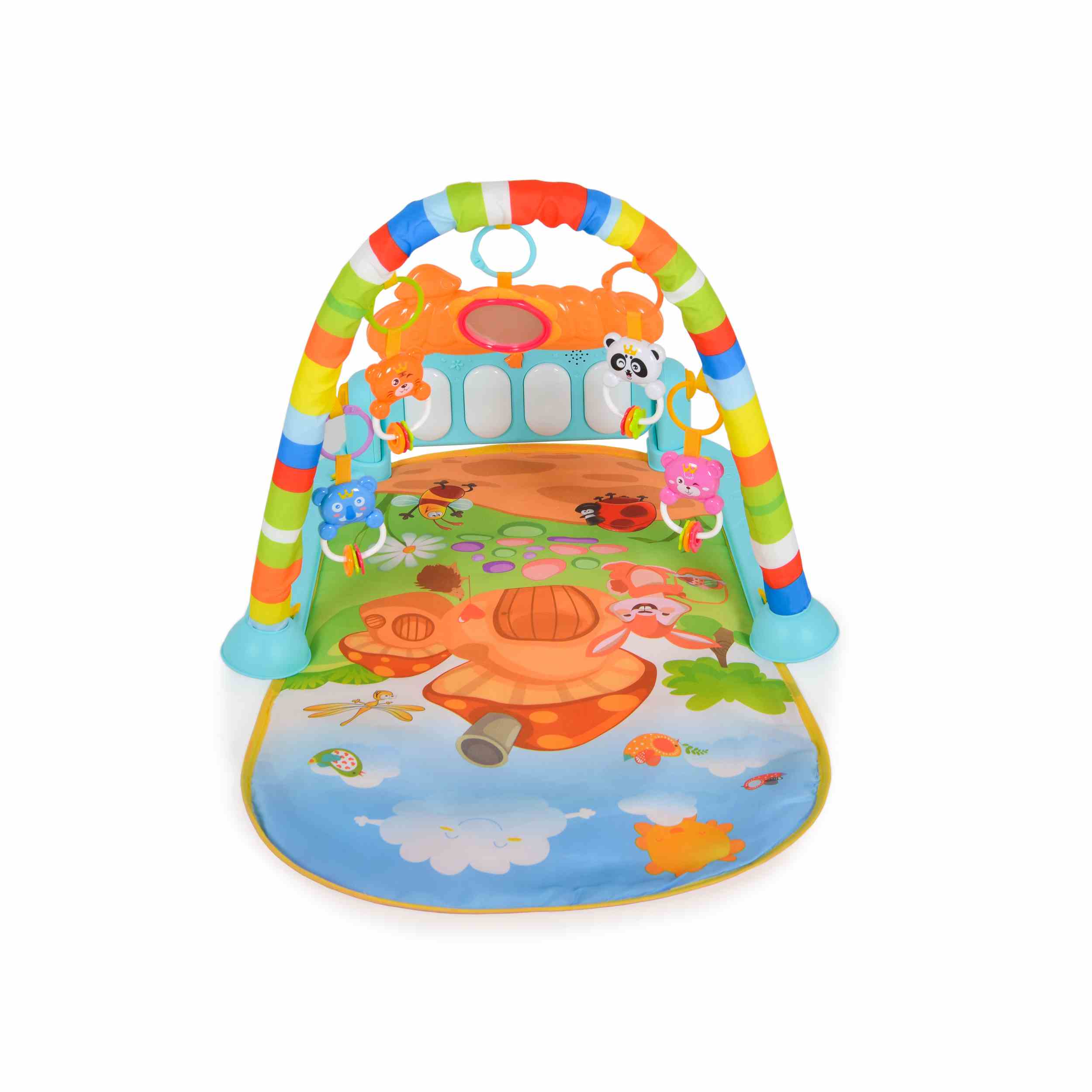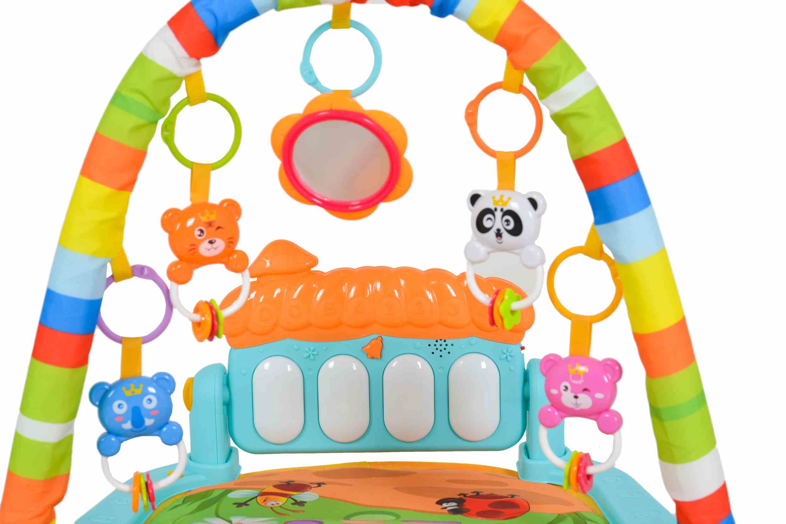 Играчки: Включва няколко висящи играчки, които могат да се окачат на грифовете, стимулирайки двигателните умения и координацията око-ръка.