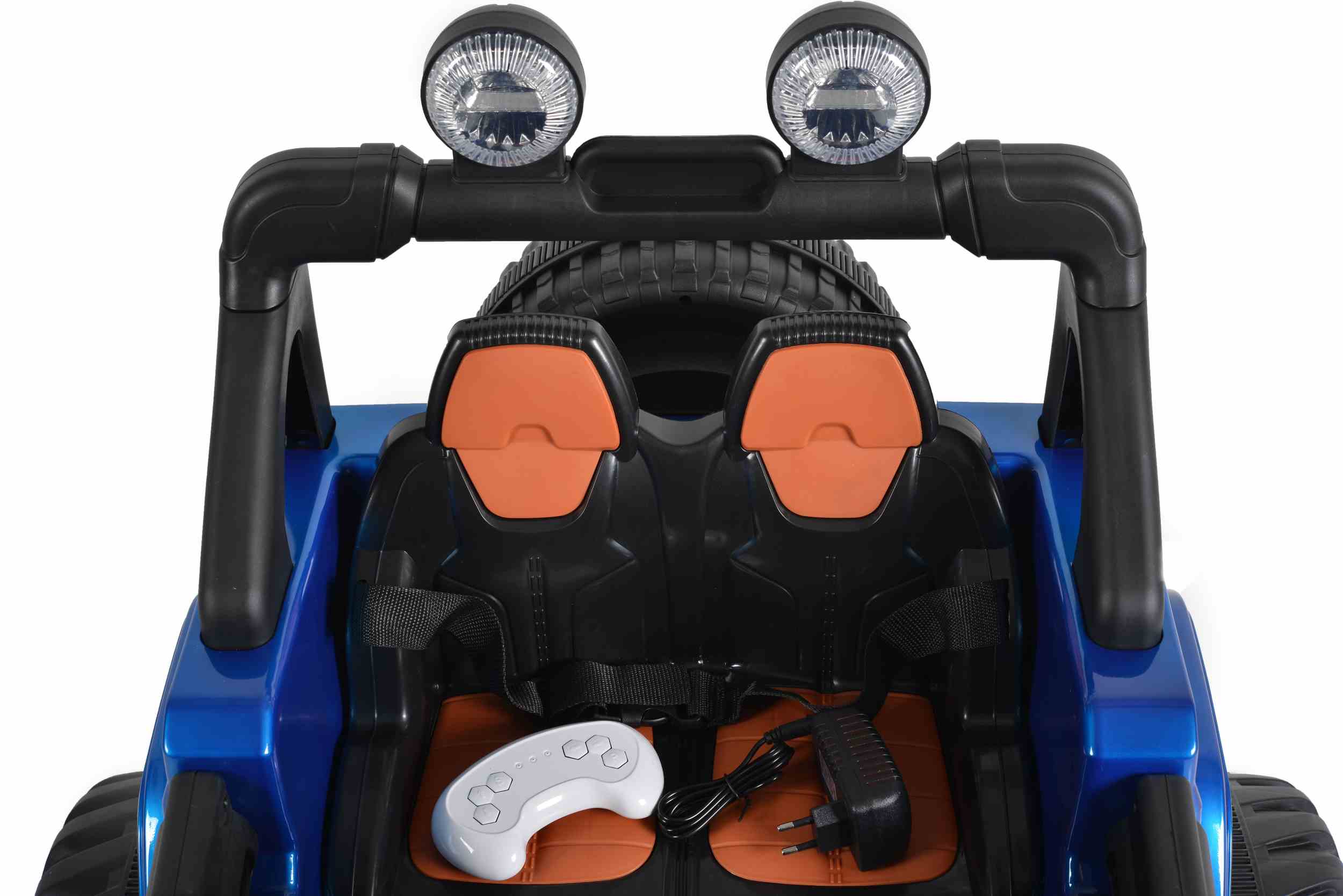 Детето може да го управлява напълно идентично с управлението на истински автомобил: завой наляво и надясно, преден и заден ход, спиране. Гумите са пластмасови. Джипът има добавен предпазен колан за максимална сигурност. Може да се избира бърза или бавна скорост.