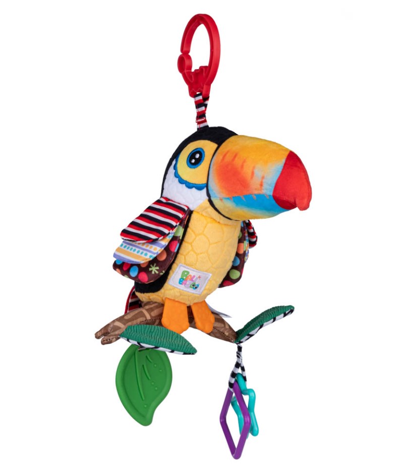 Функции: Играчката включва камбанка, скрита в корема на тукана, която издава весел звук при разклащане. Освен това, играчката има прикрепена гризалка, която осигурява облекчение на сърбящите венци.