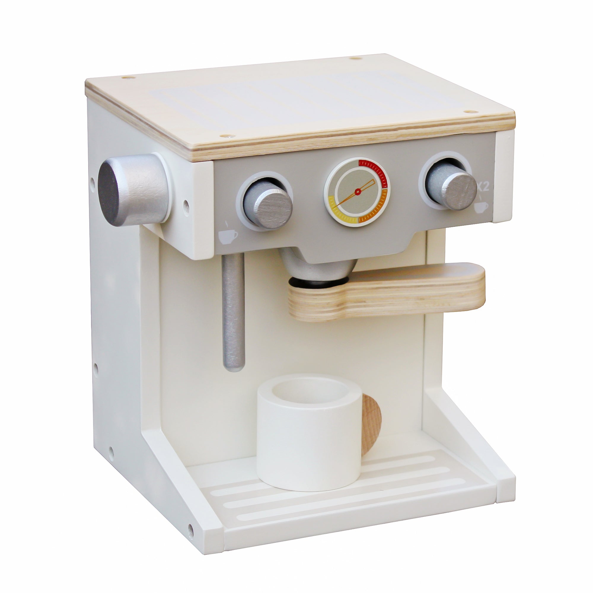 Детска Дървена Кафемашина – Бяло-Сиво. Тази безопасна и забавна дървена кафемашина предлага часове на незабравими игри за децата. Подобрявайки техните фини моторни умения и умения за споделяне и решаване на проблеми.