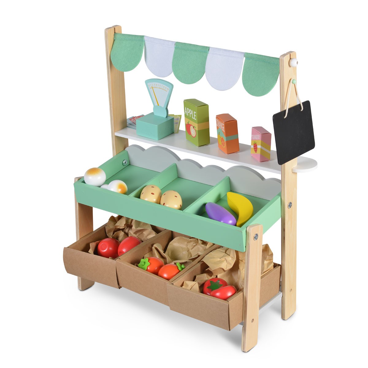 Детска играчка Дървен супермаркет с комплект продукти 4425 е магически портал към света на възрастните, предназначен да разпали въображението и търговските умения на малките деца.
