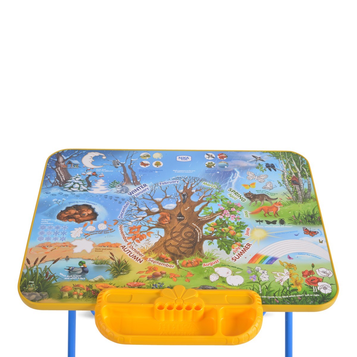 Образователен дизайн: Върху масата са изобразени четирите сезона и множество други образователни картини, които стимулират интереса и знанието за природата.