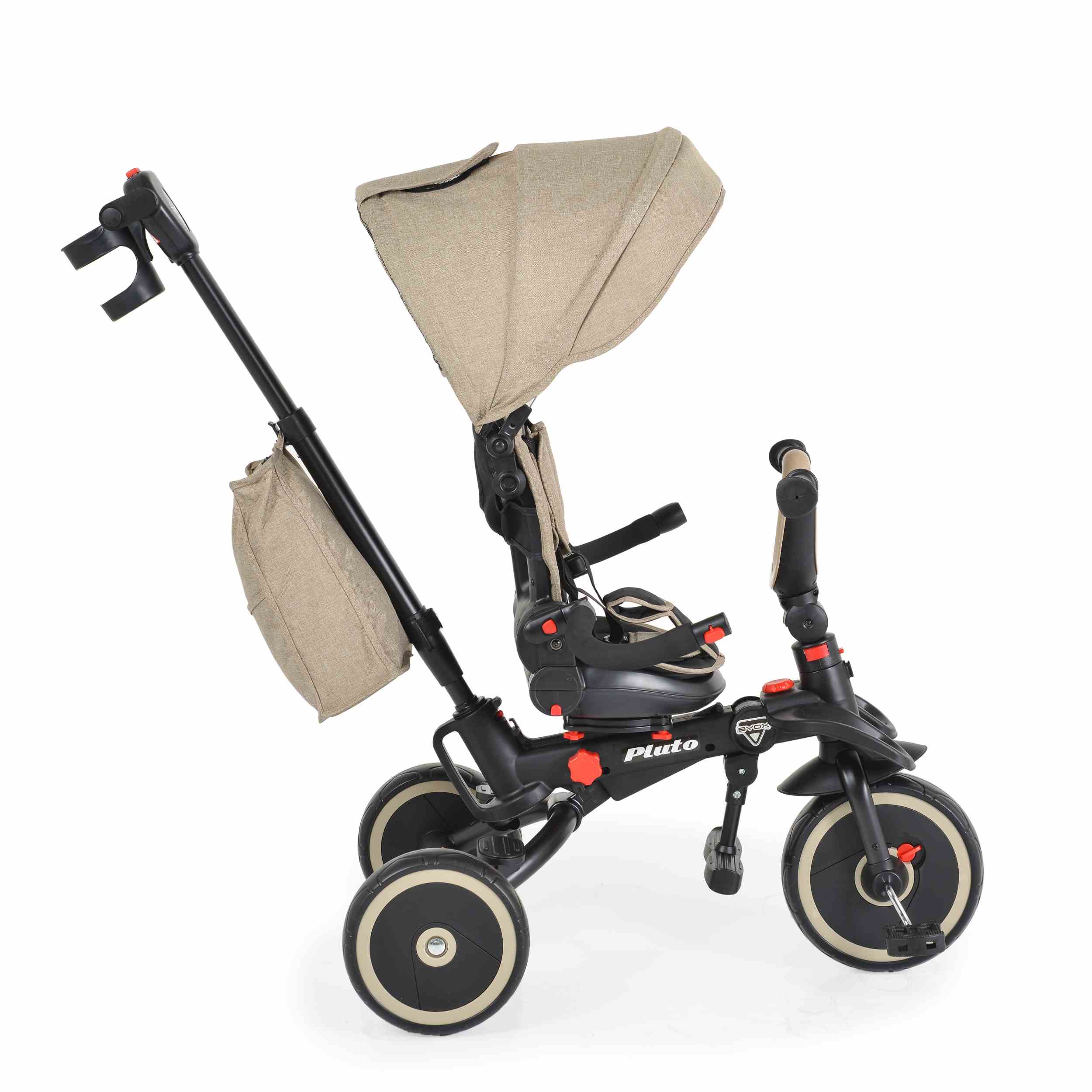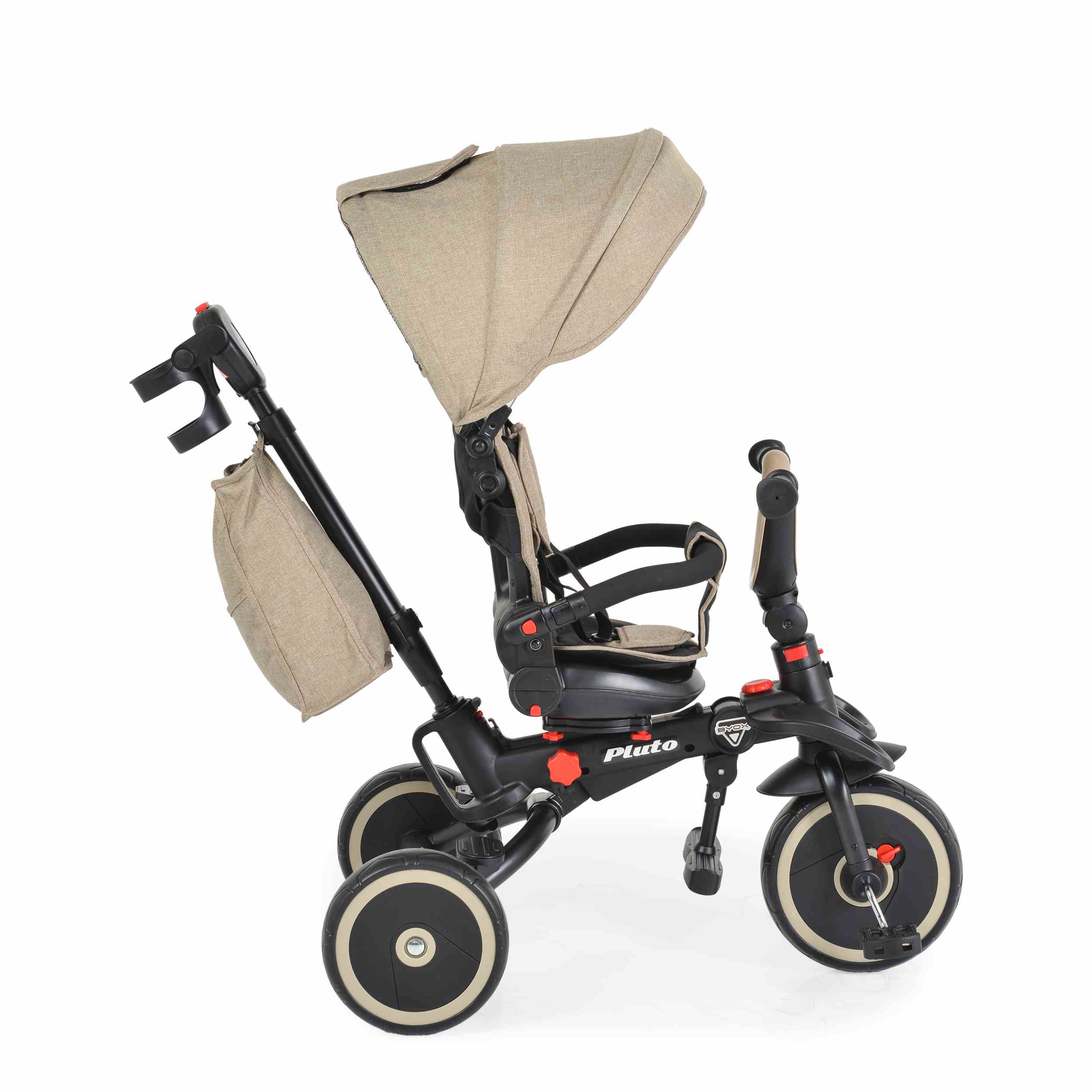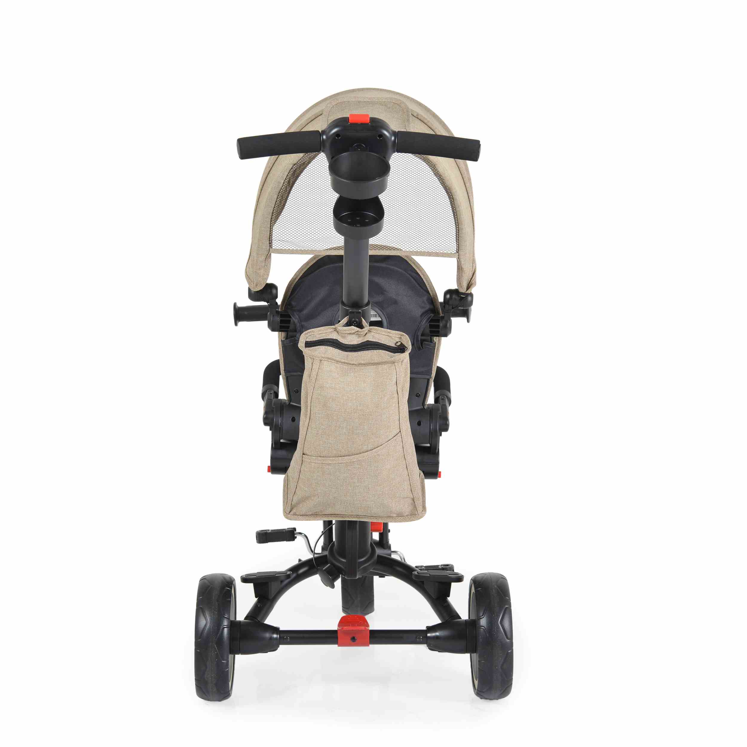 Чанта за играчки и поставка за чаши или шишета: Тази триколка разсполага с практични аксесоари за необходимите малки вещи по време на разходка.