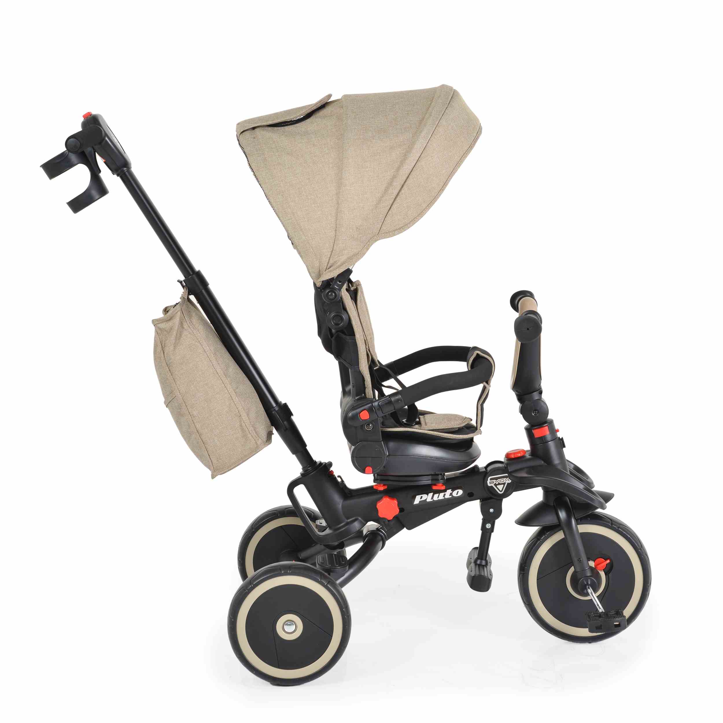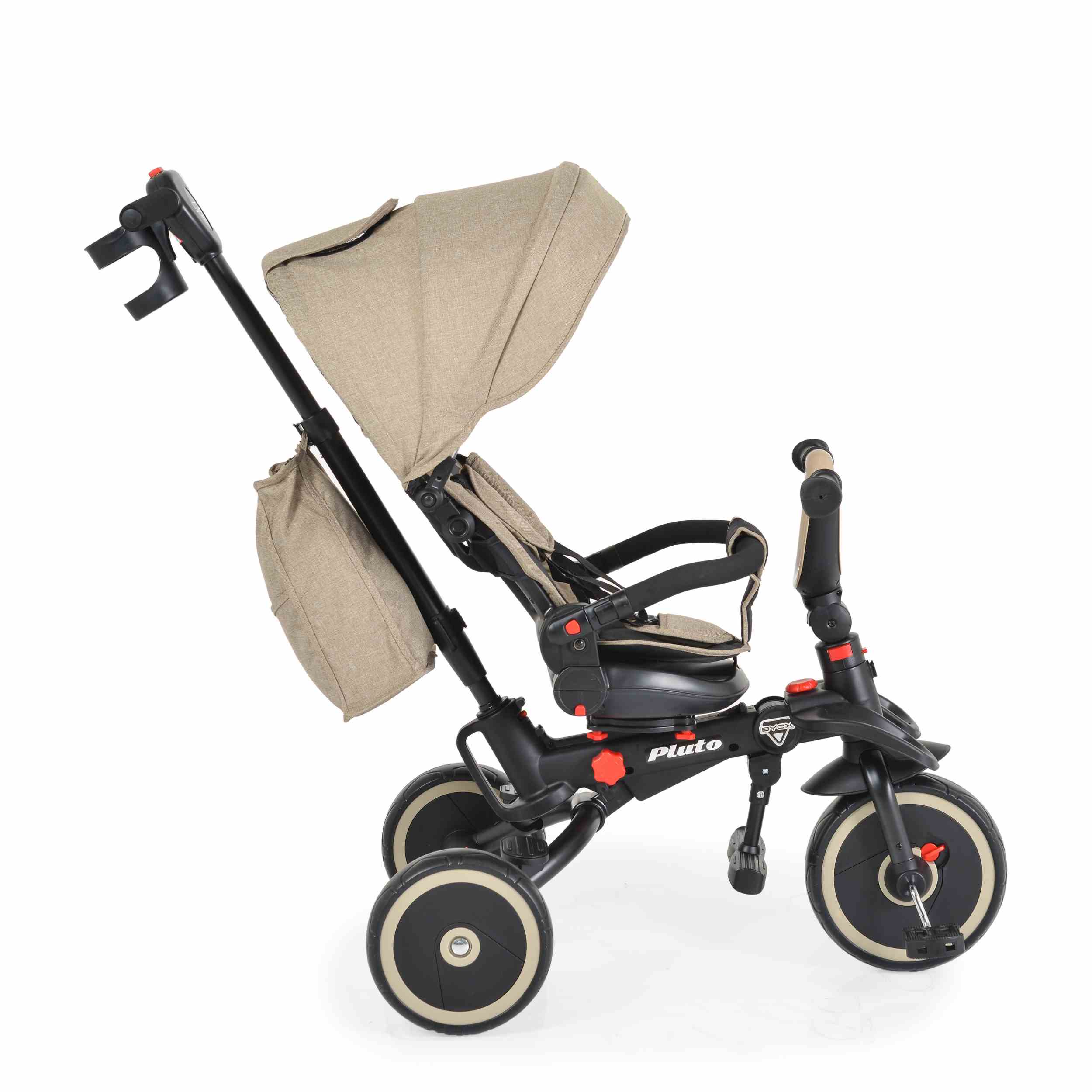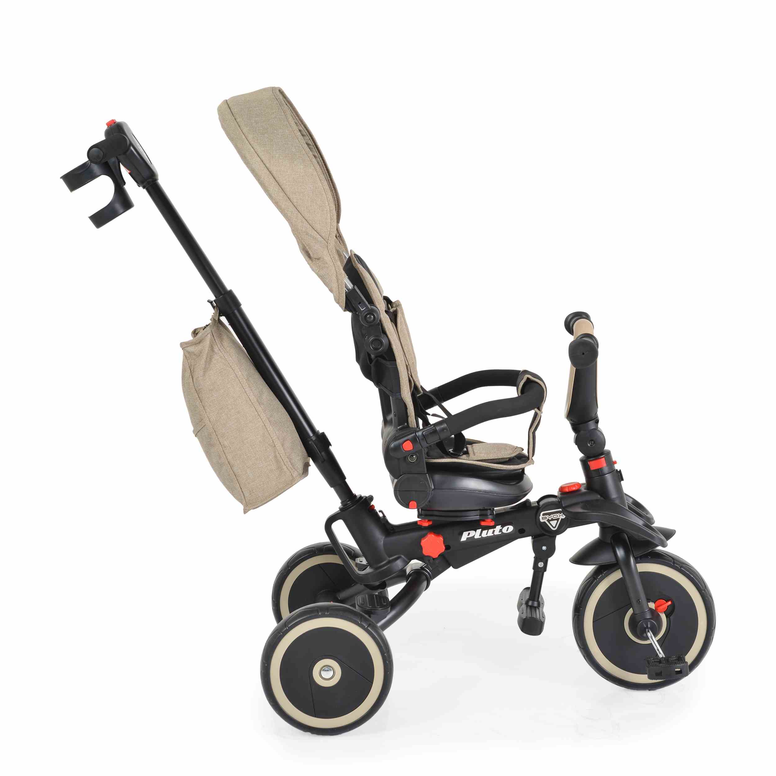 Чанта за играчки и поставка за чаши или шишета: Тази триколка разсполага с практични аксесоари за необходимите малки вещи по време на разходка.