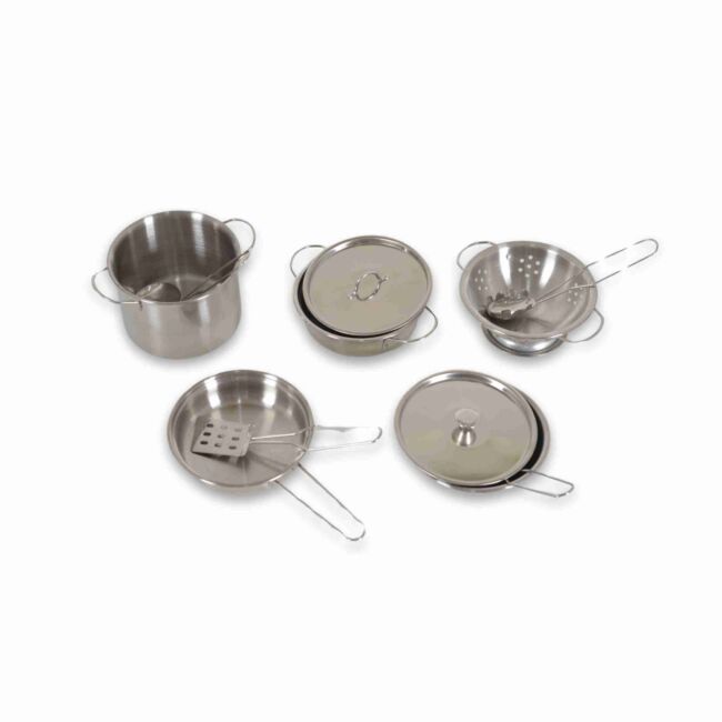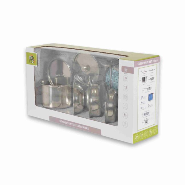 1. Комплектът включва: 12 части, които представляват миниатюрни версии на истински кухненски прибори. Това може да включва тенджери, тигани, лъжици, вилици, ножове, черпаци и други.