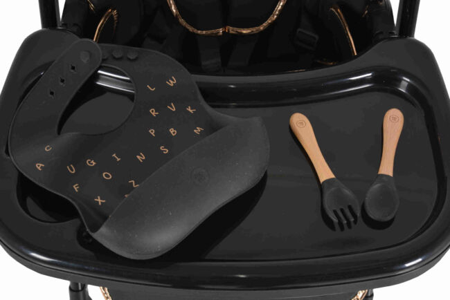 2. Подарък: Комплектът включва силиконов лигавник, лъжица и вилица, които допълват удобството и функционалността на стола.