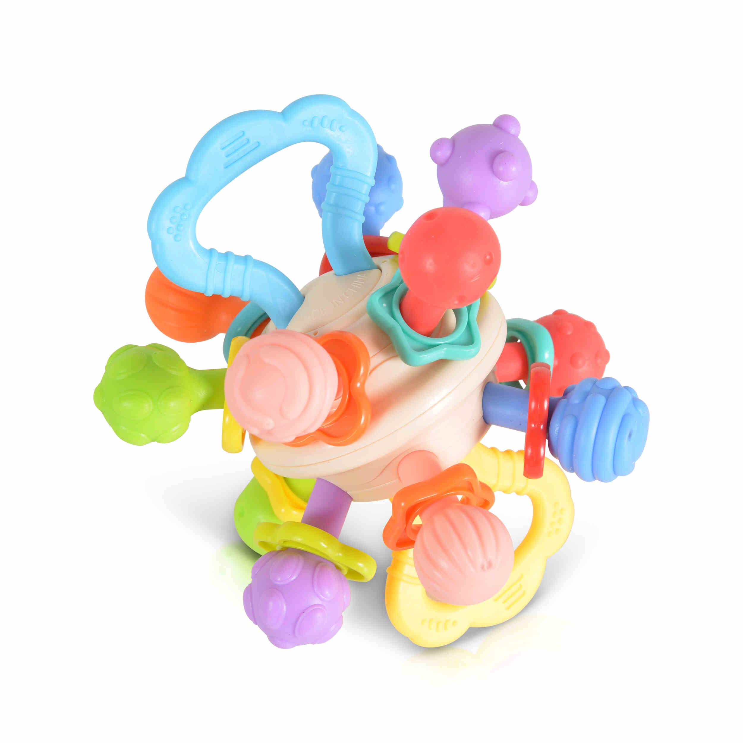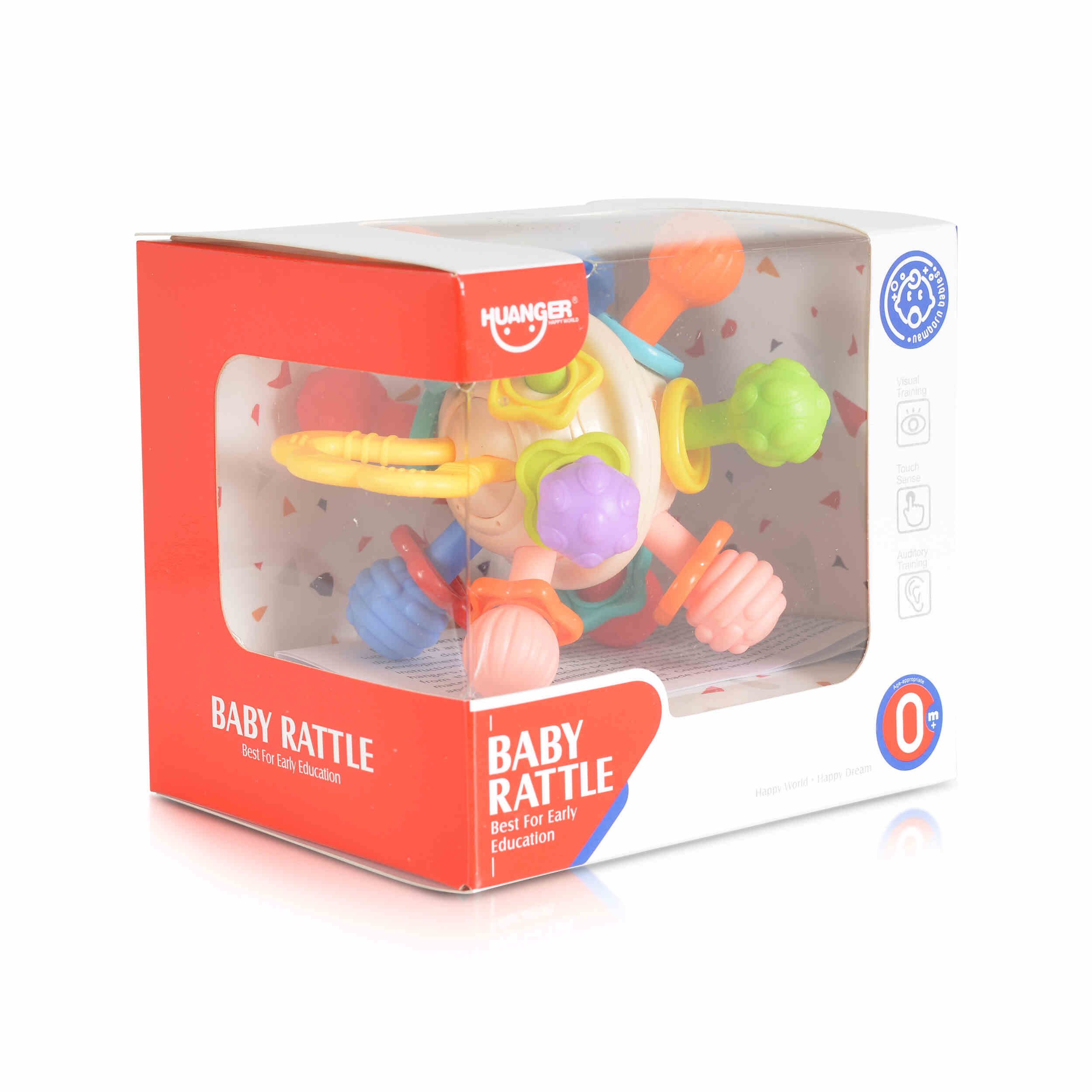 • Дизайн: Цветна и привлекателна топка с вградена дрънкалка, която издава нежни звуци при разклащане.