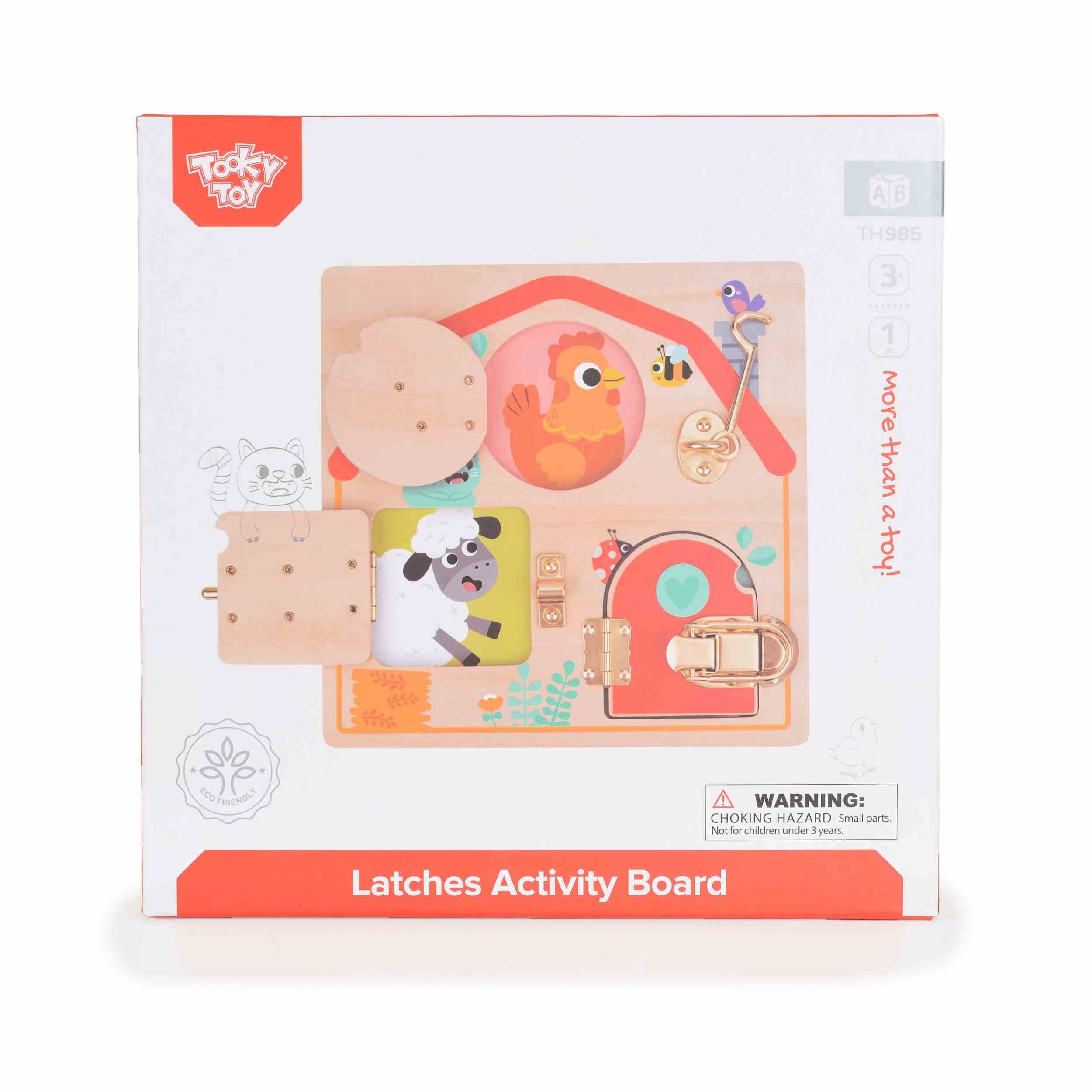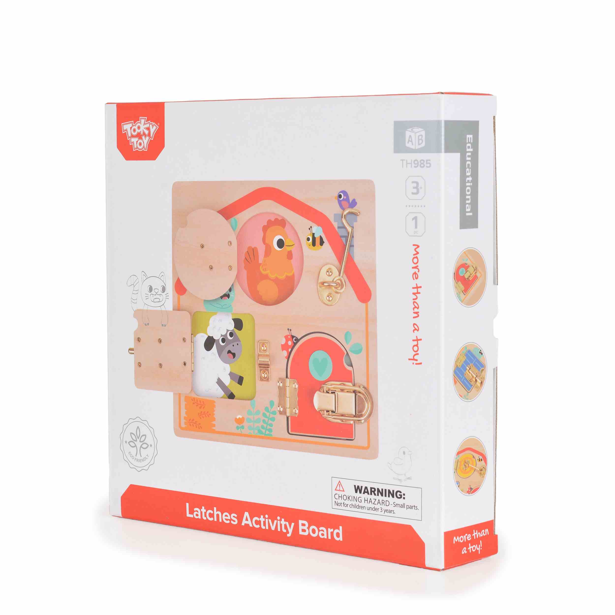Дъската включва множество резета, ключалки и закопчалки, които децата могат да отключват и заключват. Това помага за развиване на координацията между ръцете и очите и подобрява сръчността.