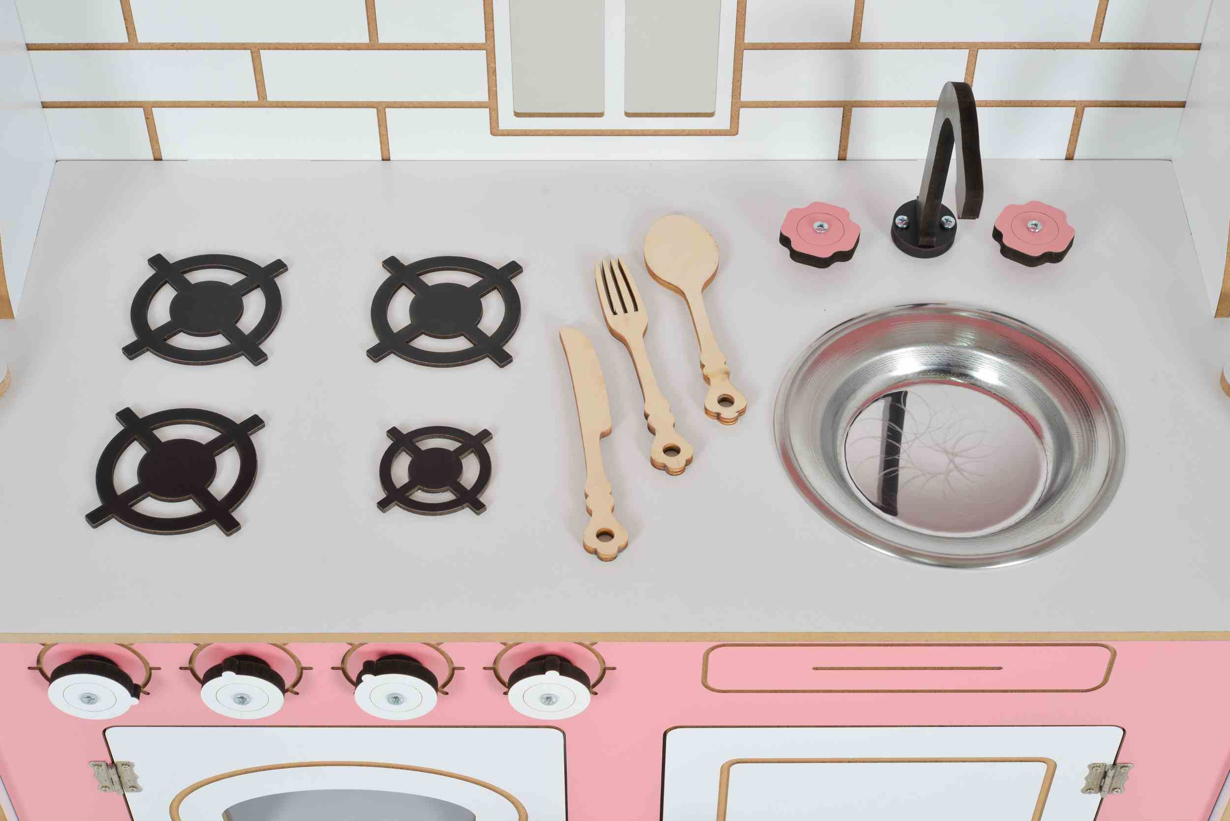 Мивка, печка и котлони: Тази детска кухня разполага с мивка, печка и котлони, които създават усещане за реалистичност и позволяват на децата да се потопят в света на готвенето.