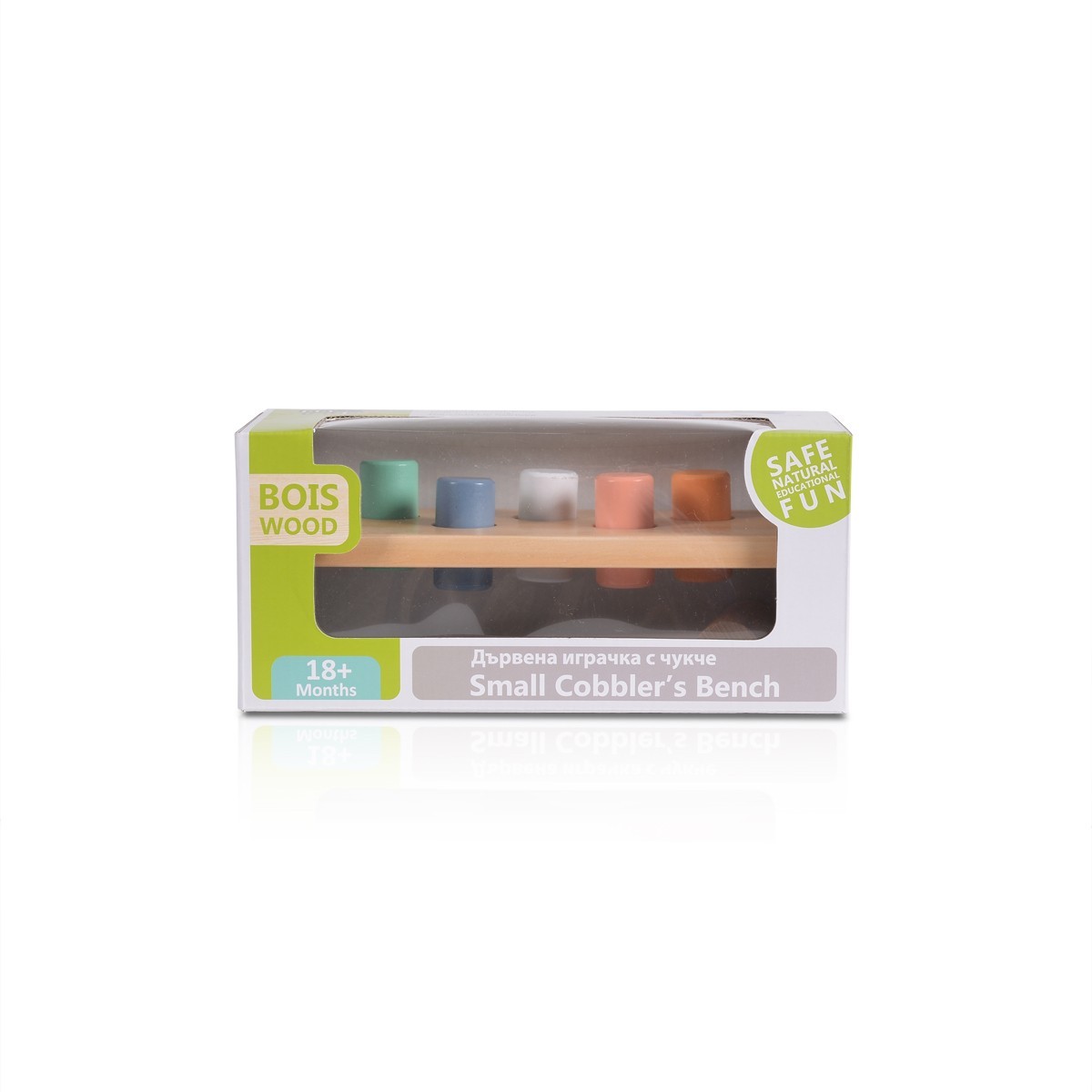 Комплект за игра: Комплектът включва дървена дъска с отвори, пет цветни цилиндъра и дървено чукче. Цилиндрите могат да бъдат поставяни в отворите и след това “набивани” с чукчето, което е изключително забавно за децата.