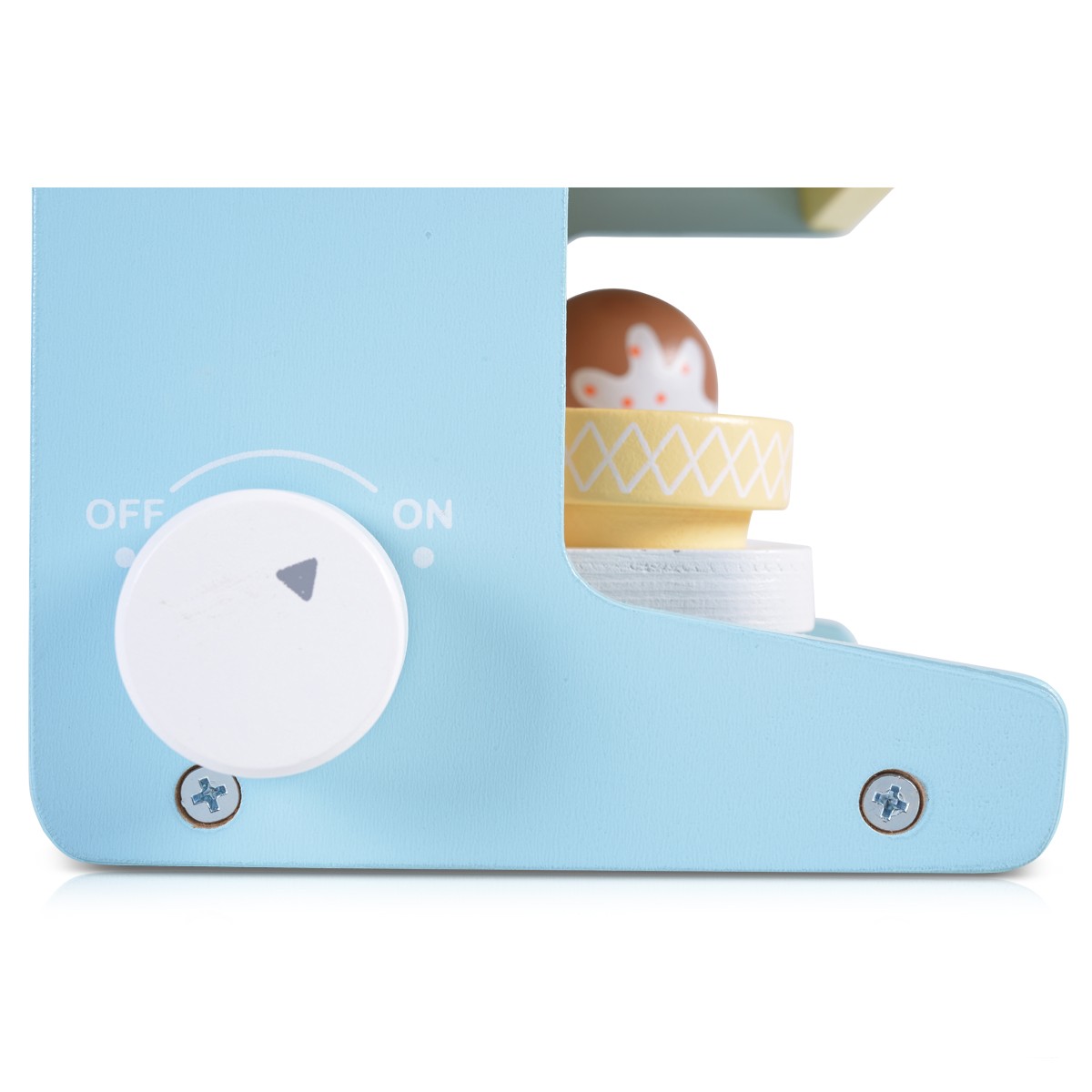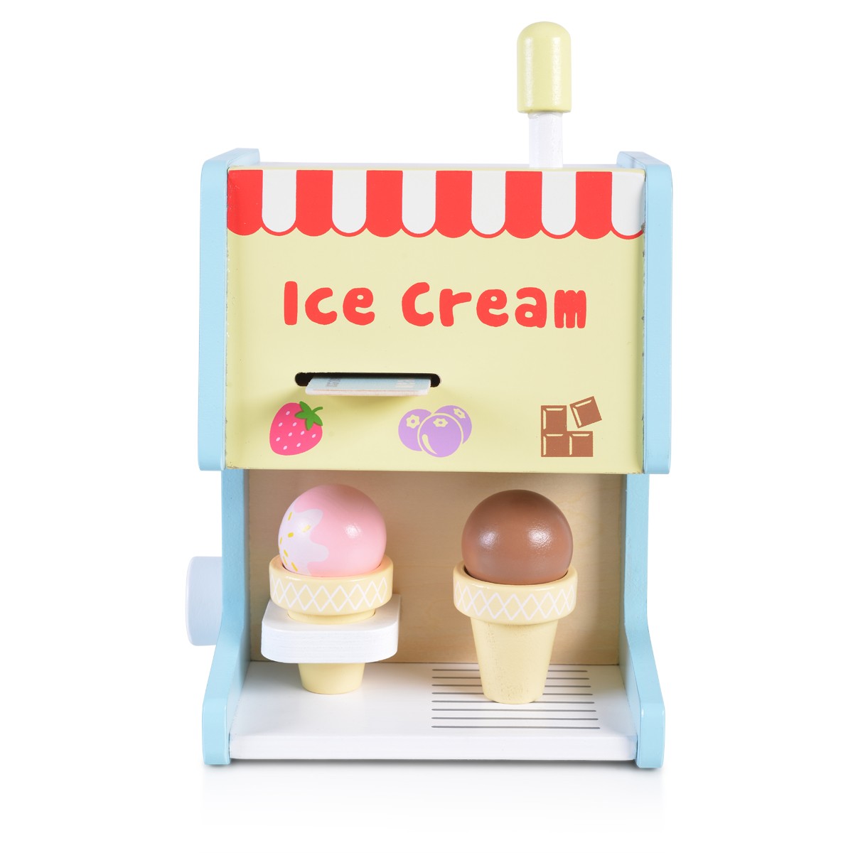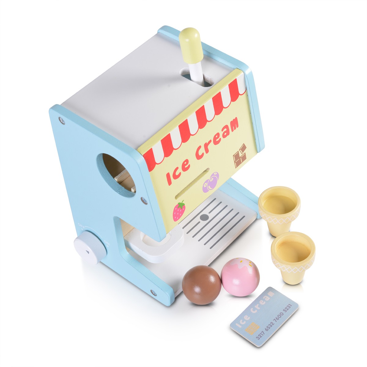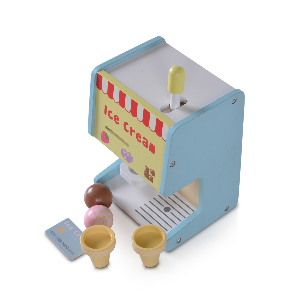 Комплектът дървена играчка машина за сладолед включва: