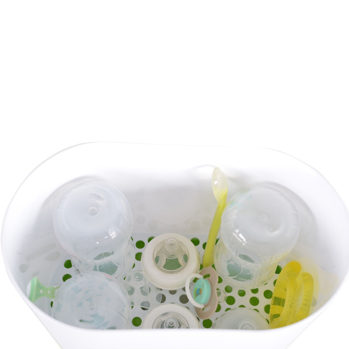 Вместимост: Стерилизира до 6 бебешки шишета (стандартни или 4 броя с широко гърло) и дребни аксесоари (биберони, залъгалки и др.) едновременно.