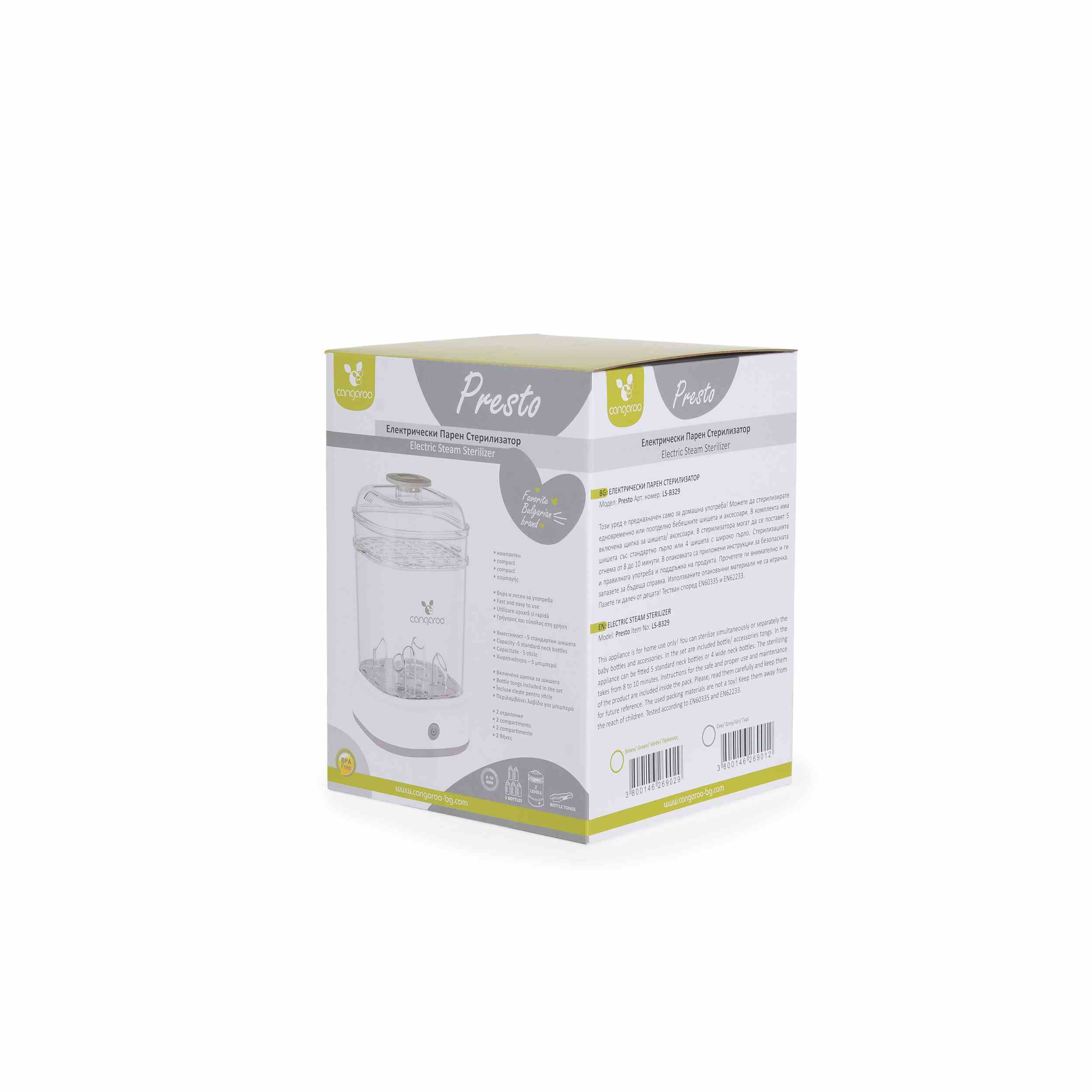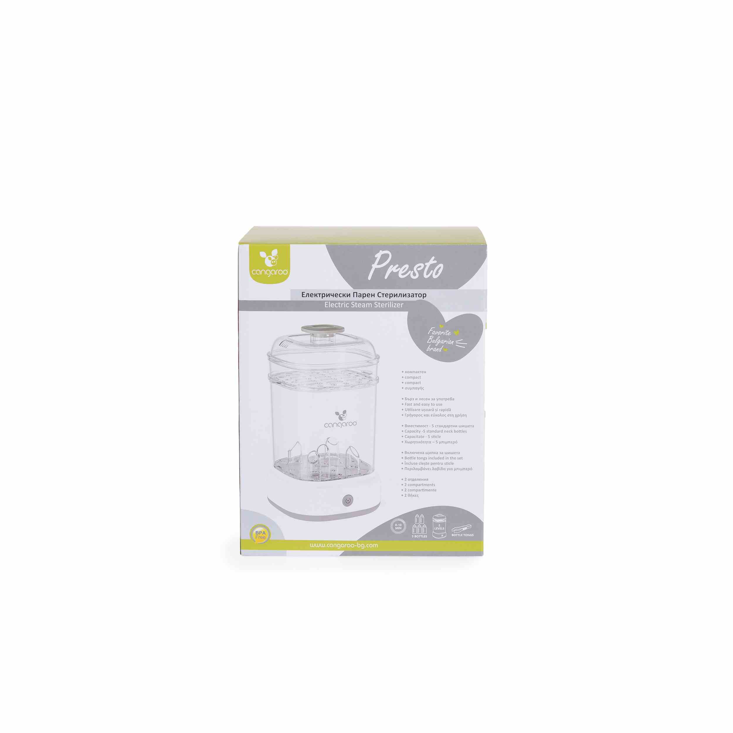 Стерилизаторът Cangaroo – Presto е създаден да улесни родителите в грижата за хигиената на бебешките шишета и аксесоари. Уредът използва интензивна топлина на парата, за да елиминира вредните бактерии, осигурявайки бърза и безопасна стерилизация.