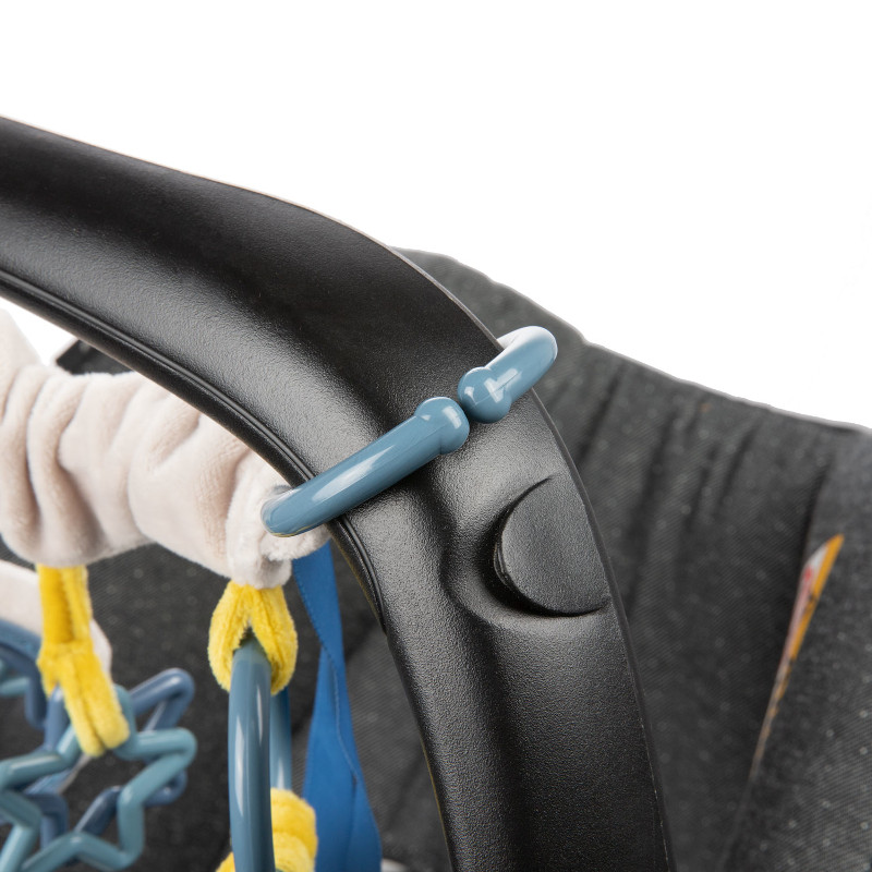 Тази играчка е проектирана да се закача лесно за дръжката на бебешка количка, кошара или столче за кола. Тя включва няколко висящи играчки с разнообразни текстури и звуци, които стимулират сетивата на бебето. Играчката има звънче, дрънкалка, шумолящи елементи, безопасно огледало и гъвкави чесалки за зъби. Тези елементи помагат на бебето да развива своите сетива и координация око-ръка.