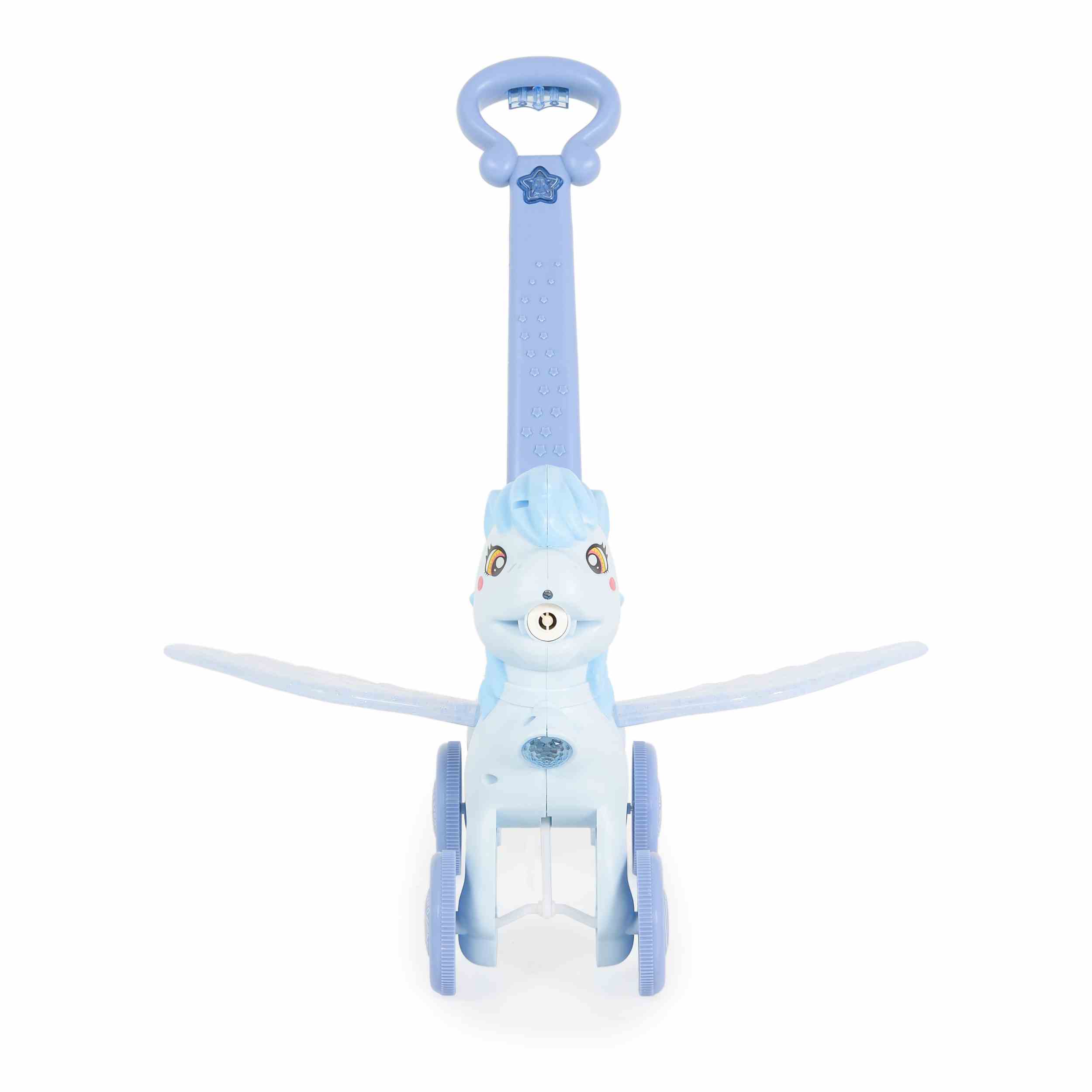 Сапунени балони: Играчката създава сапунени балони, докато детето бута пони-то, което прави играта още по-забавна и вълнуваща.
