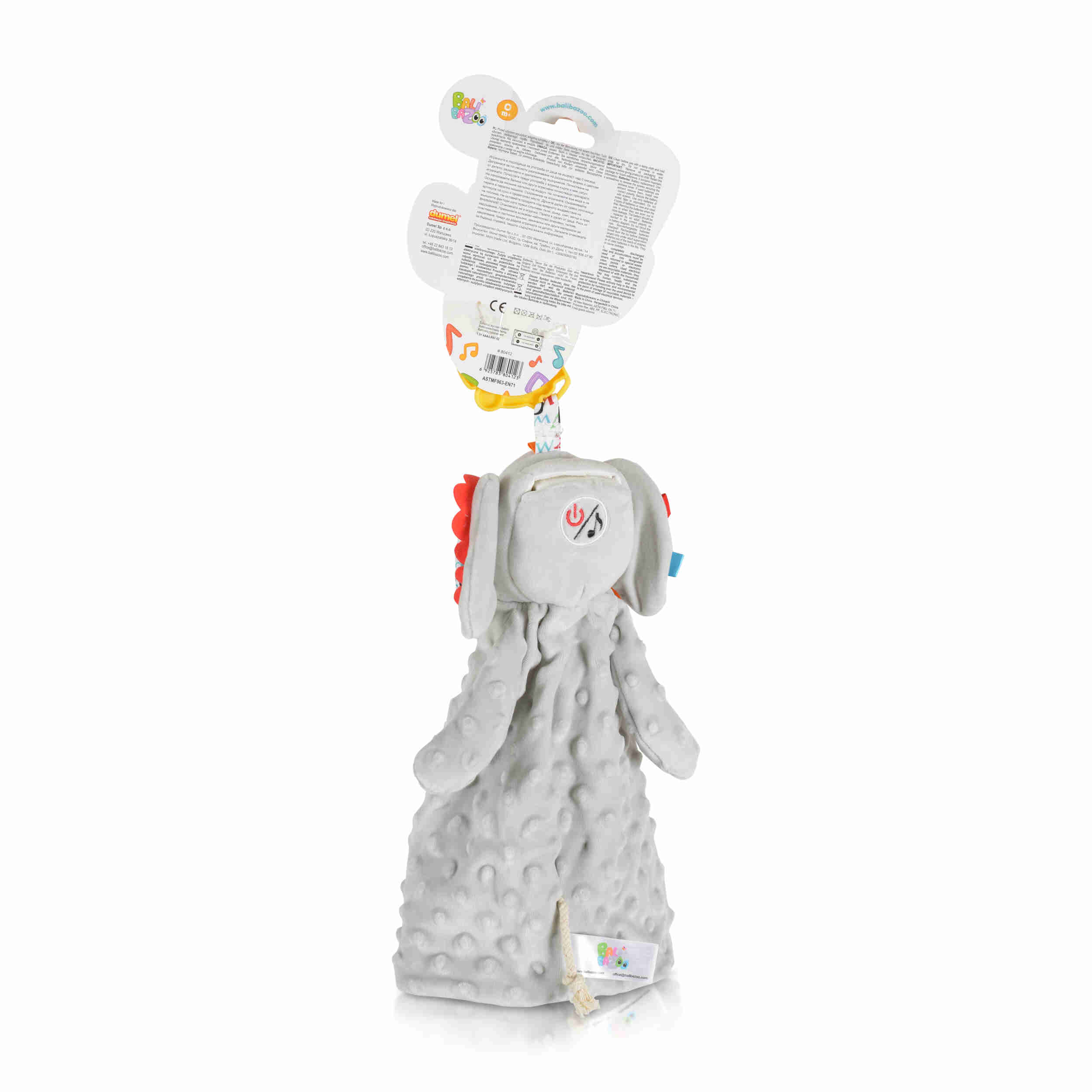 - Многофункционален дизайн: Elephant 80412 комбинира меко одеялце и интерактивна играчка със звукови функции, които забавляват и успокояват детето.