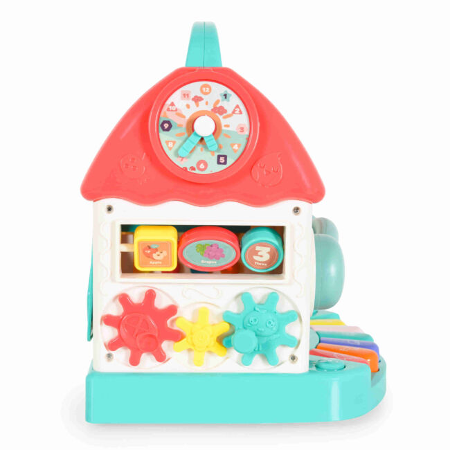 - Функции: Играчката включва различни механични активности, пиано и сортер за форми, което позволява на децата да създават различни сцени и да упражняват своите моторни умения.