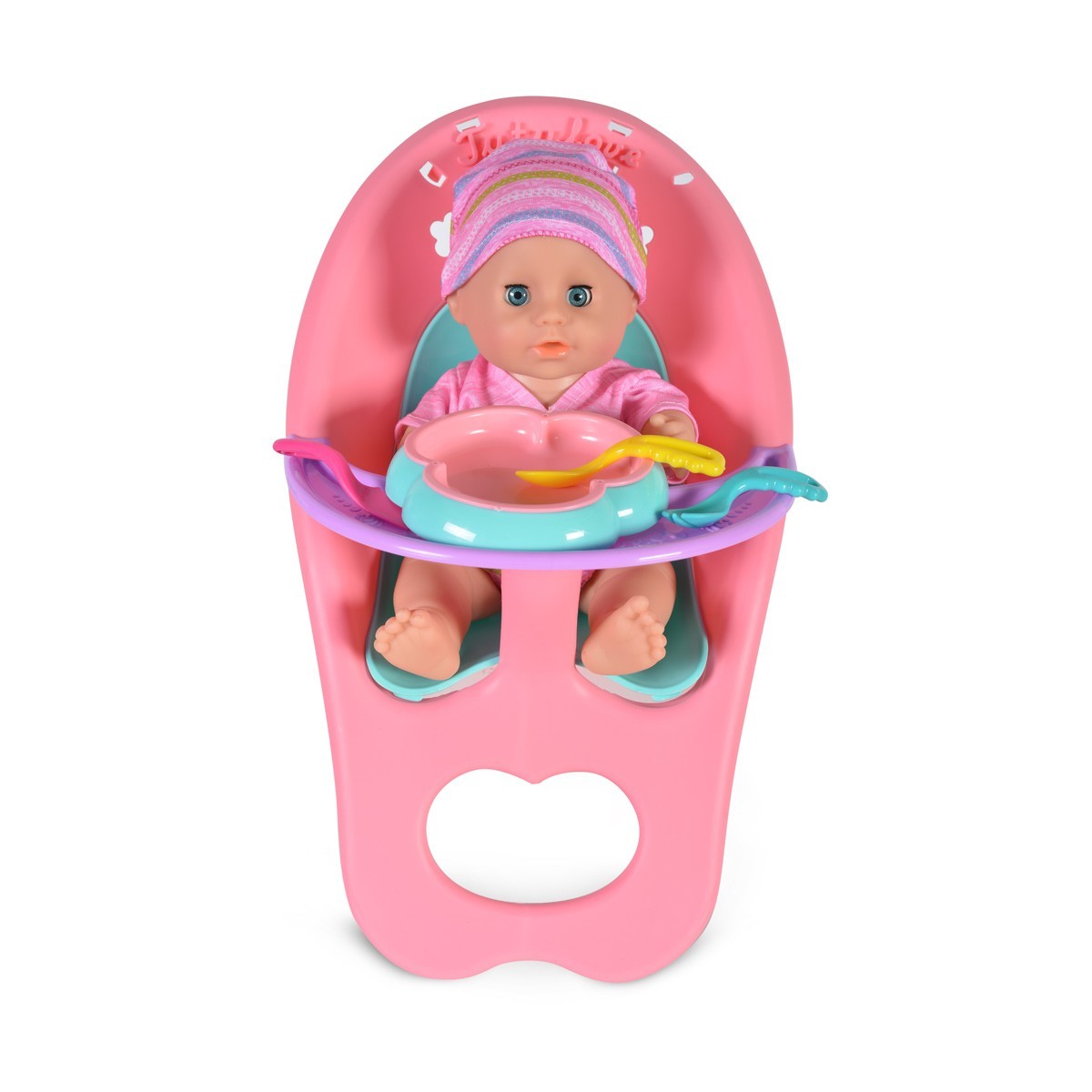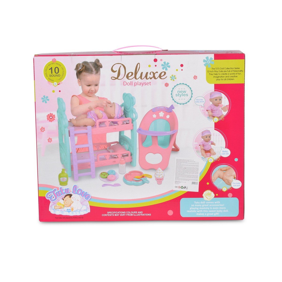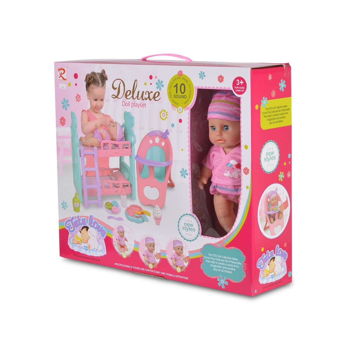 Комплектът съдържа: Освен куклата, комплектът включва шише за хранене, легло за спане и столче за хранене, което позволява на децата да се грижат за куклата си като за истинско бебе.