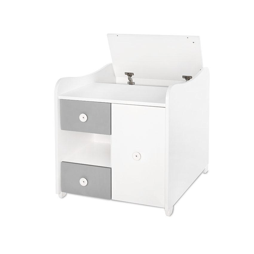Многофункционален шкаф: Включва шкаф с плот за повиване, ракла с капак и газов амортисьор, две чекмеджета и шкафче с вътрешен рафт.