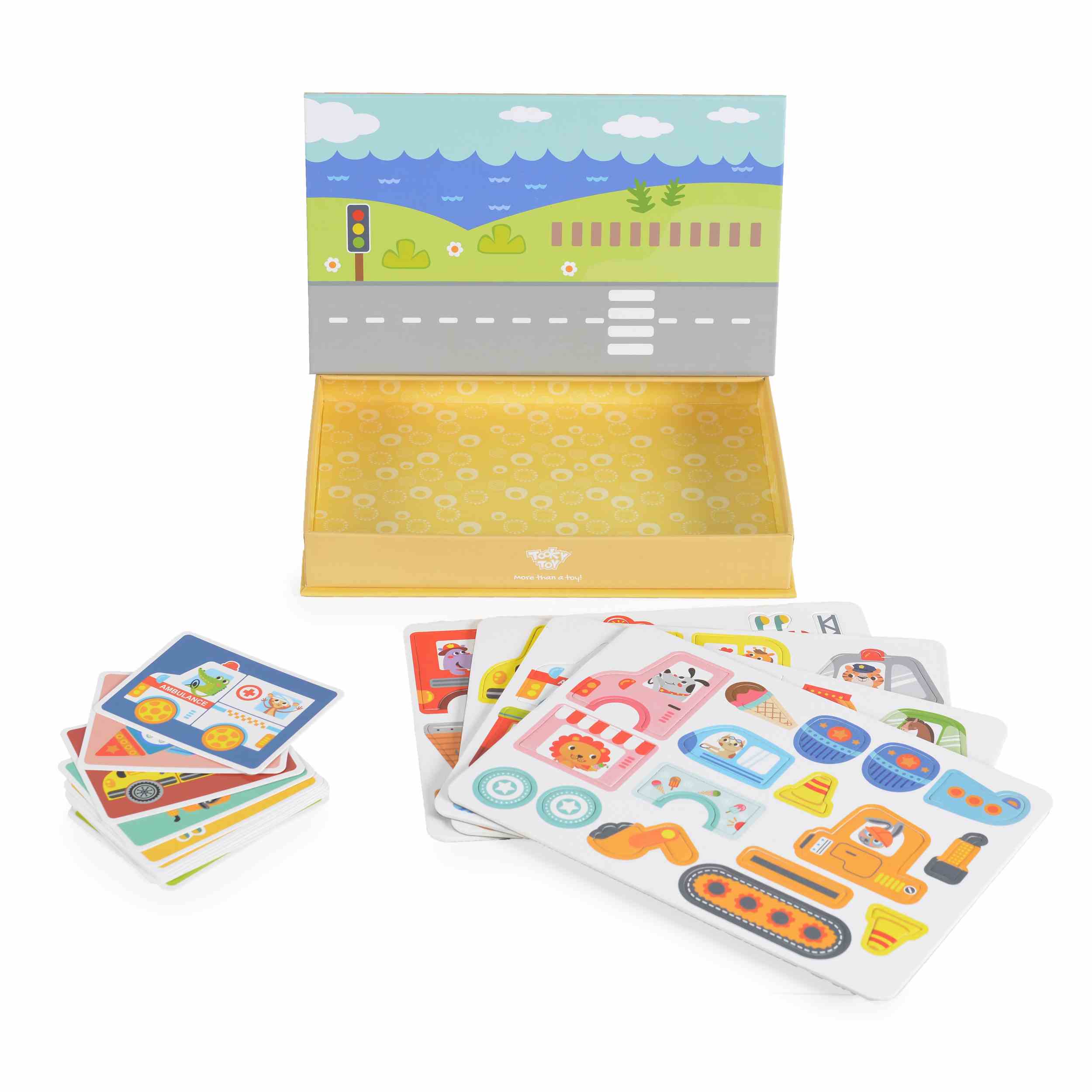 Тази магнитна кутия включва различни магнитни елементи, които децата могат да използват за създаване на различни сцени и истории, свързани с транспортни средства. Комплектът съдържа магнитна дъска и множество магнитни фигури на превозни средства като коли, самолети, влакове и кораби. Децата могат да подреждат и комбинират магнитите по различни начини, което стимулира тяхното въображение и креативност.