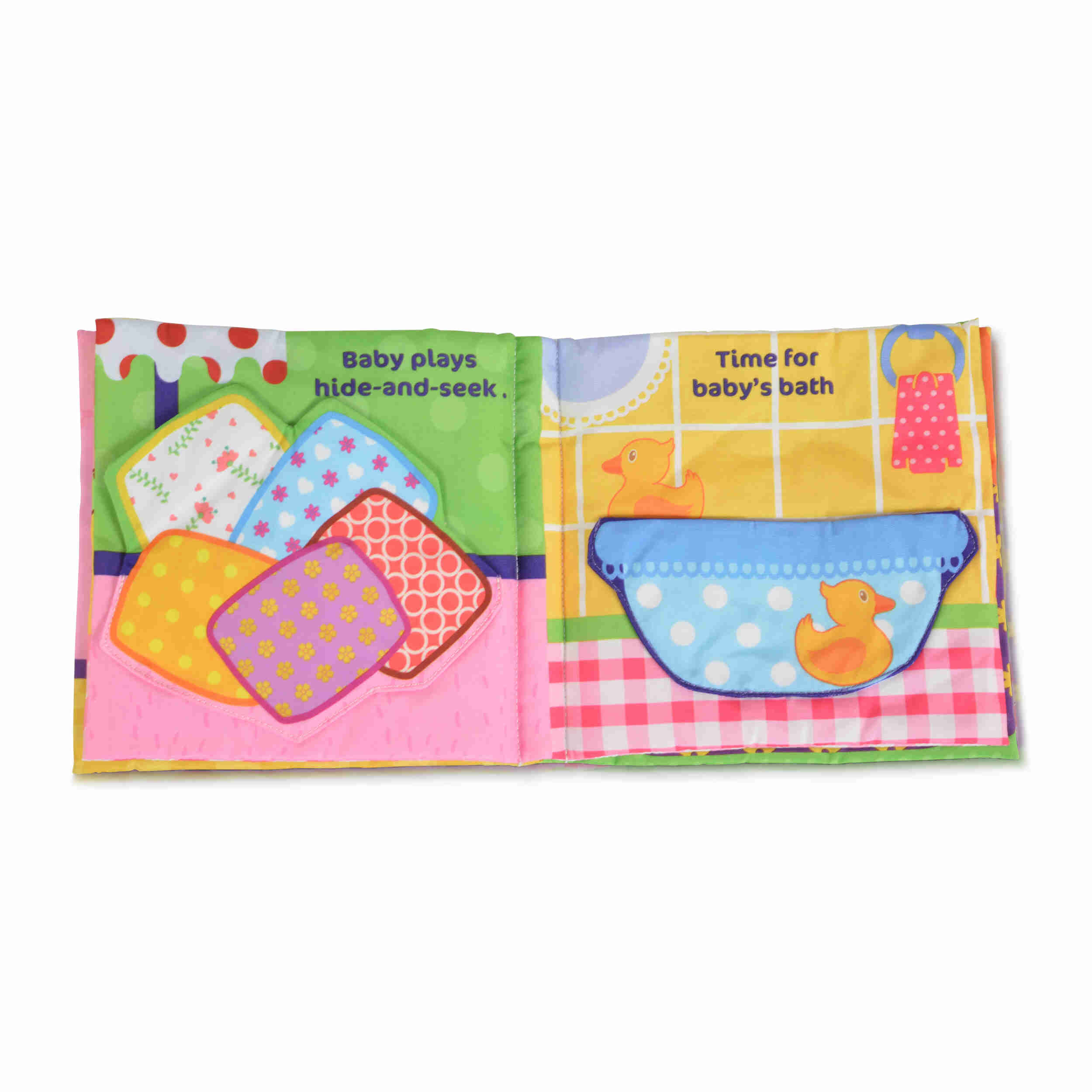 - Интерактивно съдържание: Книжката включва различни интерактивни елементи, като картинки, текстилни панели и джобчета, които насърчават децата да изследват и да се ангажират с играта.