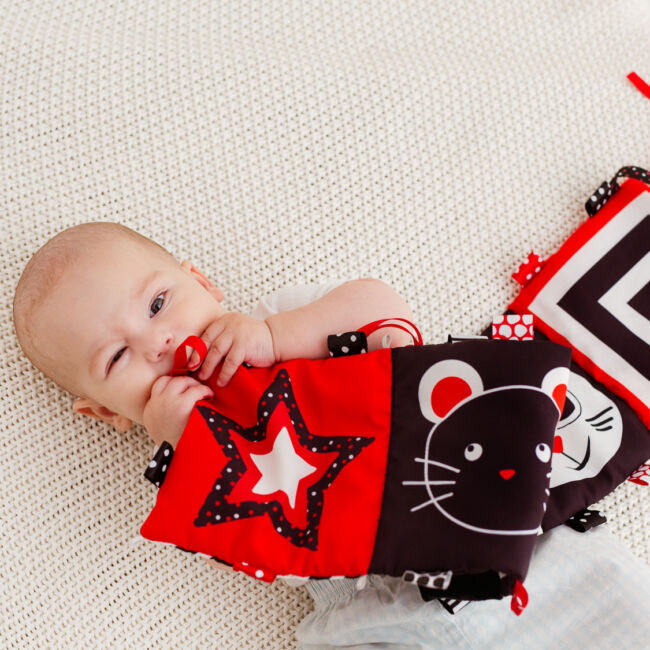 Стимулиране на сетивата: Разнообразието от цветове, текстури и контрастни изображения стимулира визуалните и тактилните сетива на бебето.