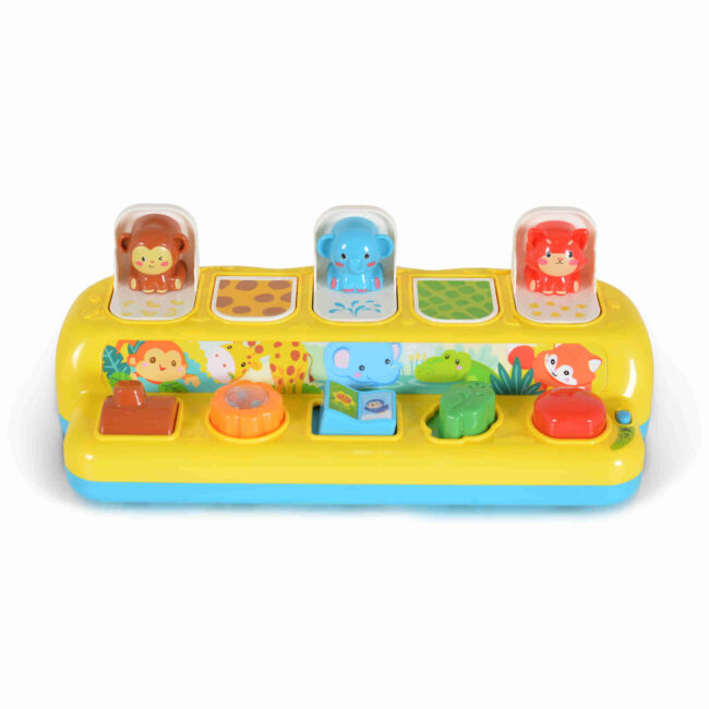 Музикална играчка PopUp Jungle 35165 включва различни животни, които изскачат при натискане на бутоните, създавайки забавни звуци и мелодии. Тази интерактивна игра насърчава координацията око-ръка и развива слуховите възприятия на децата. Цветните и ярки животни привличат вниманието и стимулират въображението на малките играчи.