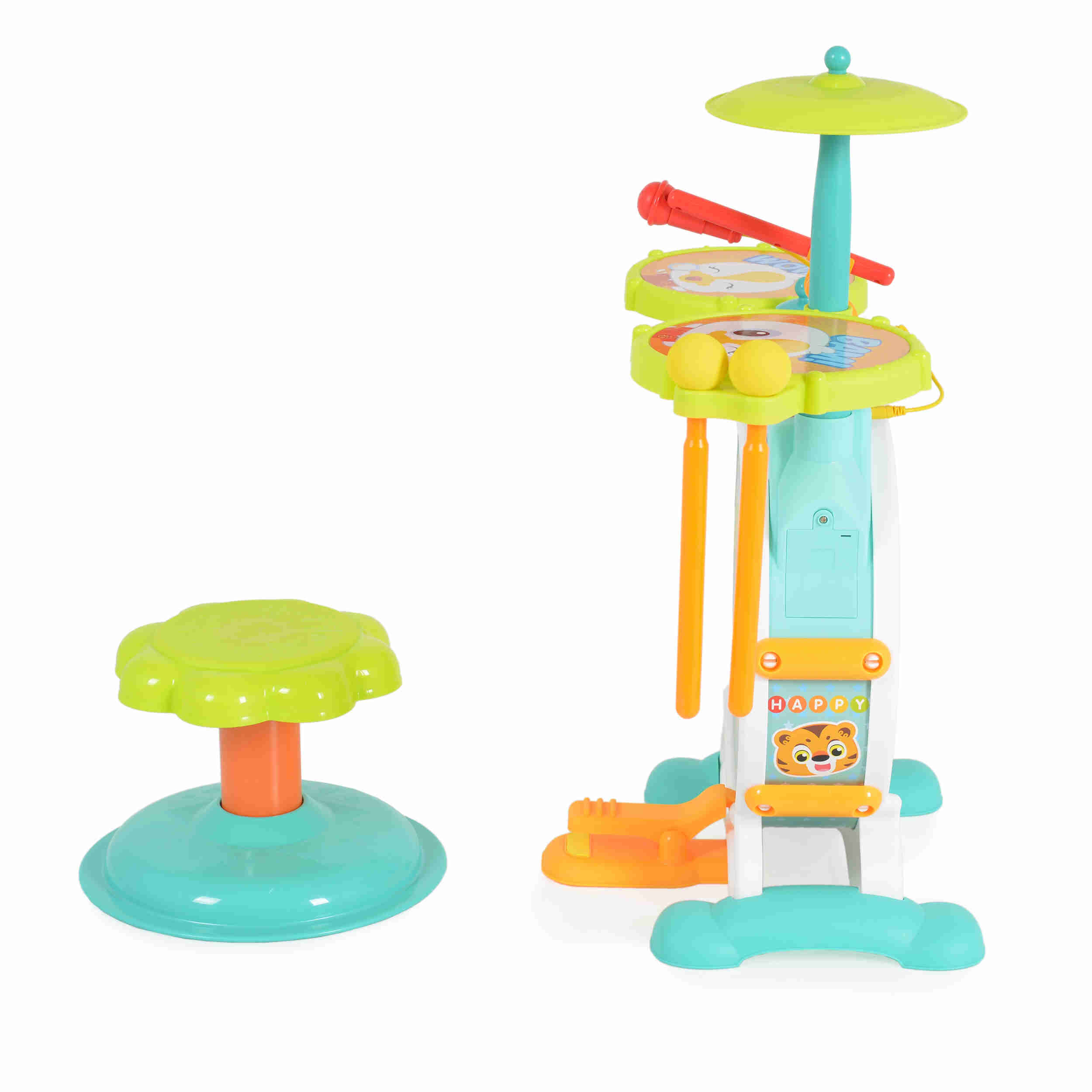 Комплект барабани: Комплектът включва два малки барабана, бас барабан и чинел, които осигуряват разнообразие и стимулират креативността на детето.