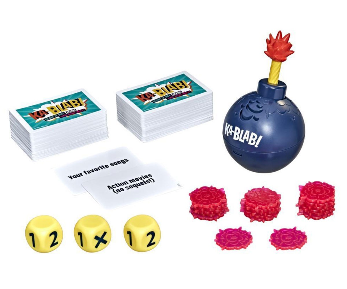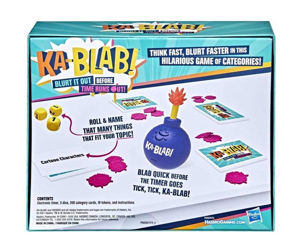 Настолна Игра на думи „Ka-Blab!“ е едно вълнуващо семейно предизвикателство, което тества бързината на мислене и реакция. В тази динамична игра на думи, играчите трябва да изричат наименованията на предмети от определена категория, показана на картата, преди времето на таймера да изтече и той да изрече „Ka-Blab!“.