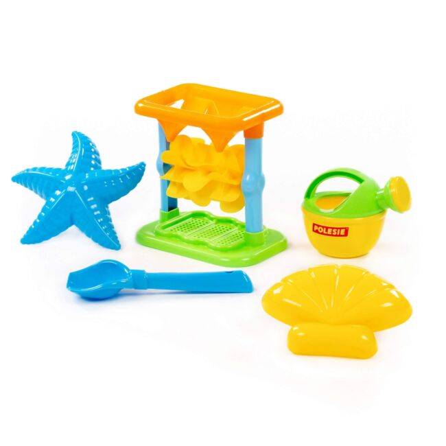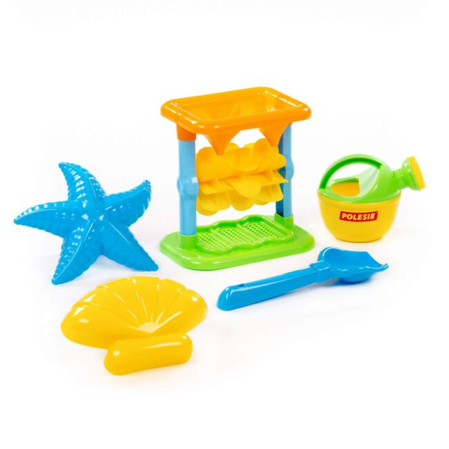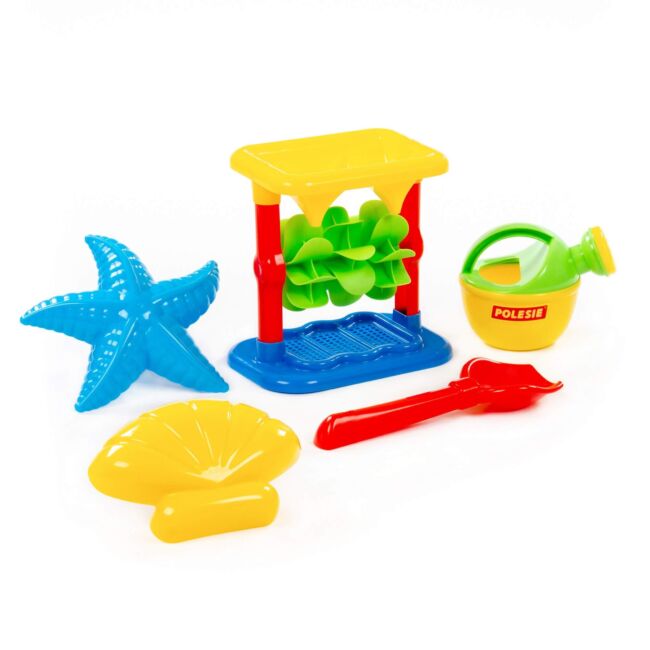 • Дизайн: Комплектът включва пет части, които са внимателно проектирани, за да осигурят максимално забавление. Основният елемент е мелницата, която позволява на децата да изсипват пясък или вода и да наблюдават как се въртят лопатките. Останалите части включват кофичка, лопатка, гребло и формичка, които допълват играта.