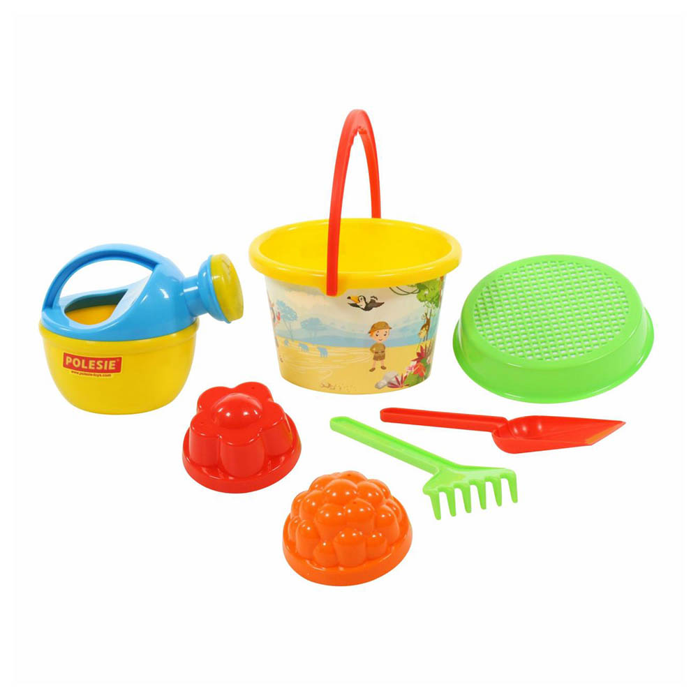 - Съдържание: Комплектът включва 1 бр. лейка, 1 бр. изрисувана плажна кофичка, 1 бр. сито, 1 бр. гребло, 1 бр. лопатка и 2 бр. формички за пясък2.