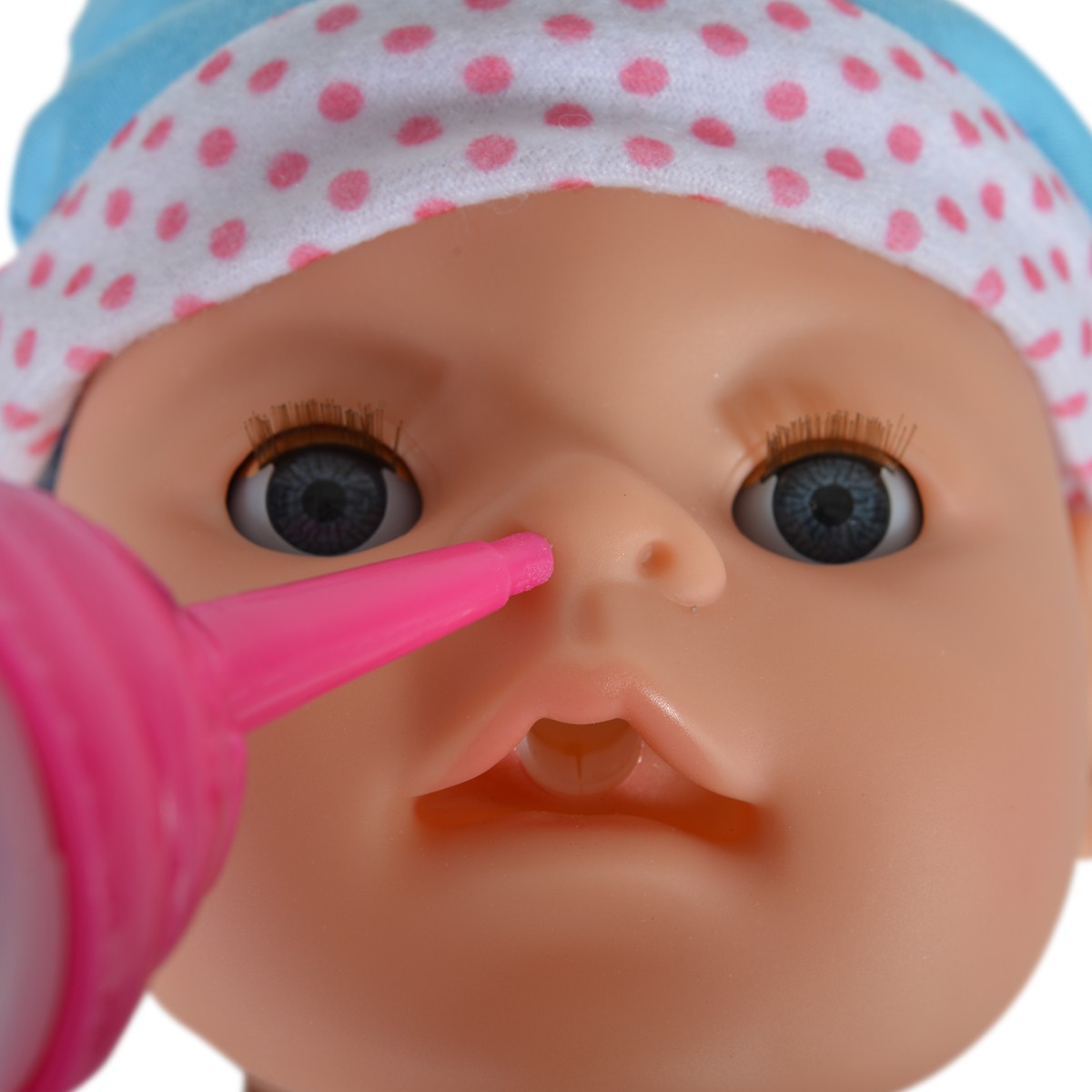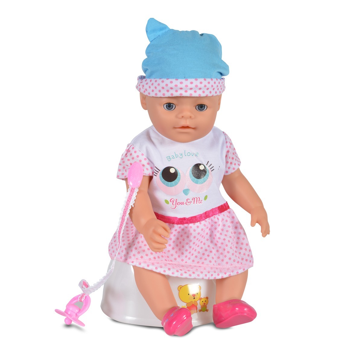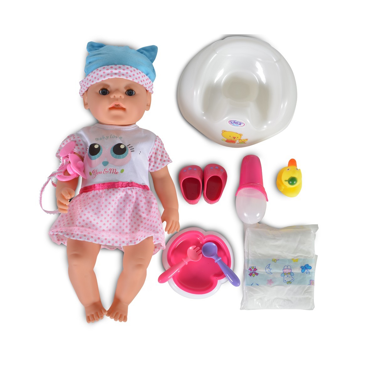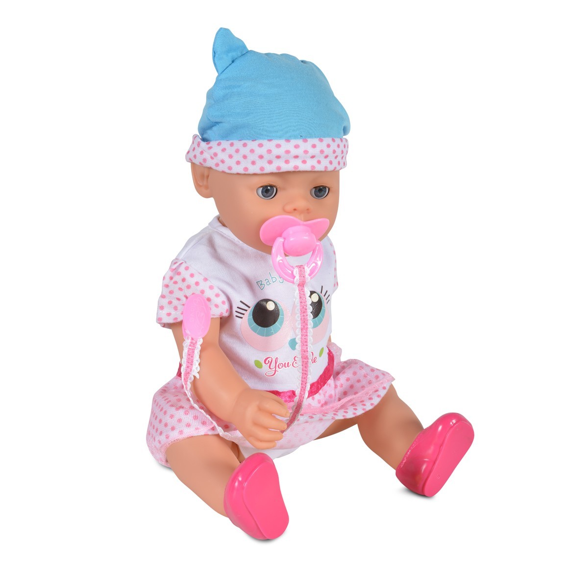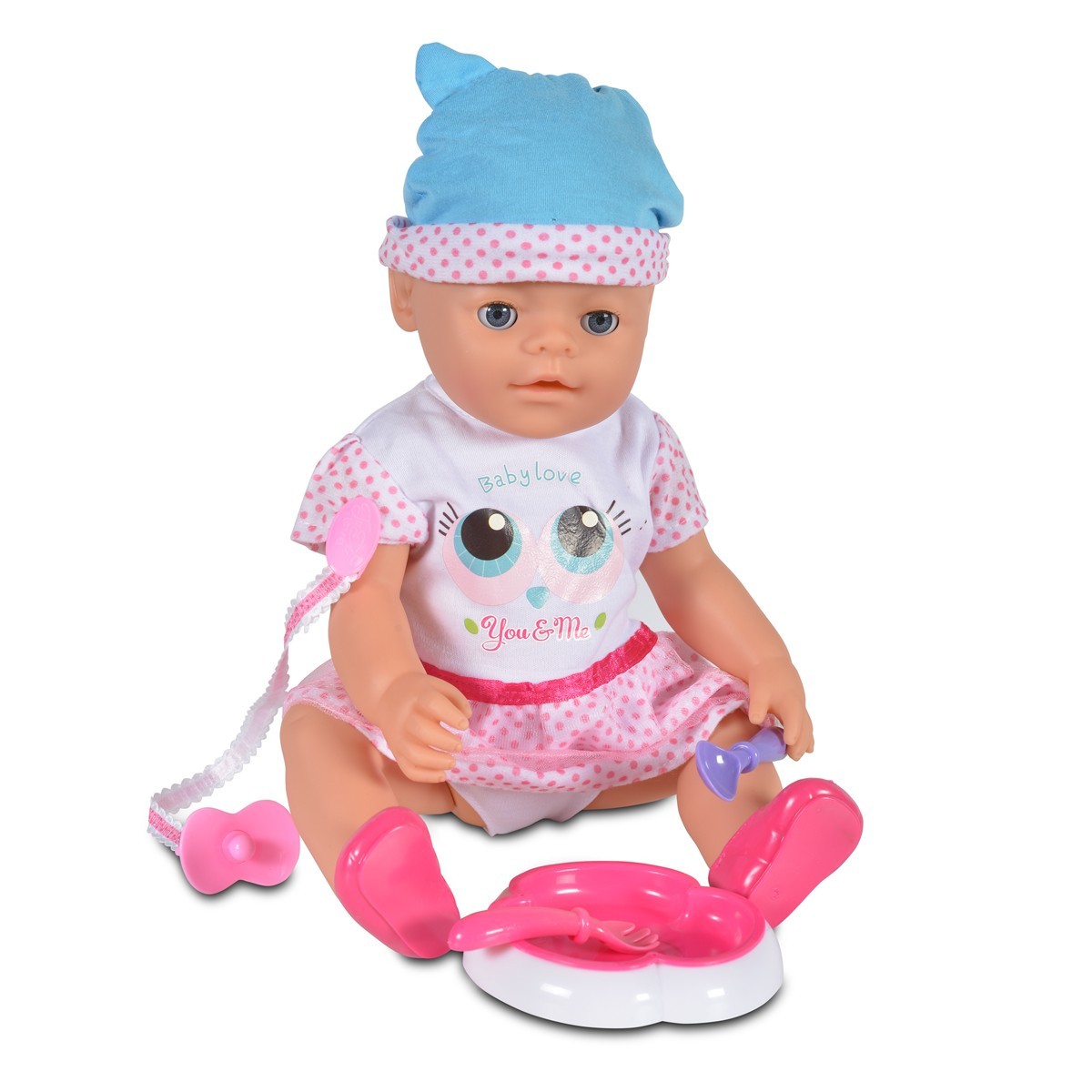 Плачеща кукла бебе 46cm със синя шапка, гърне и аксесоари
