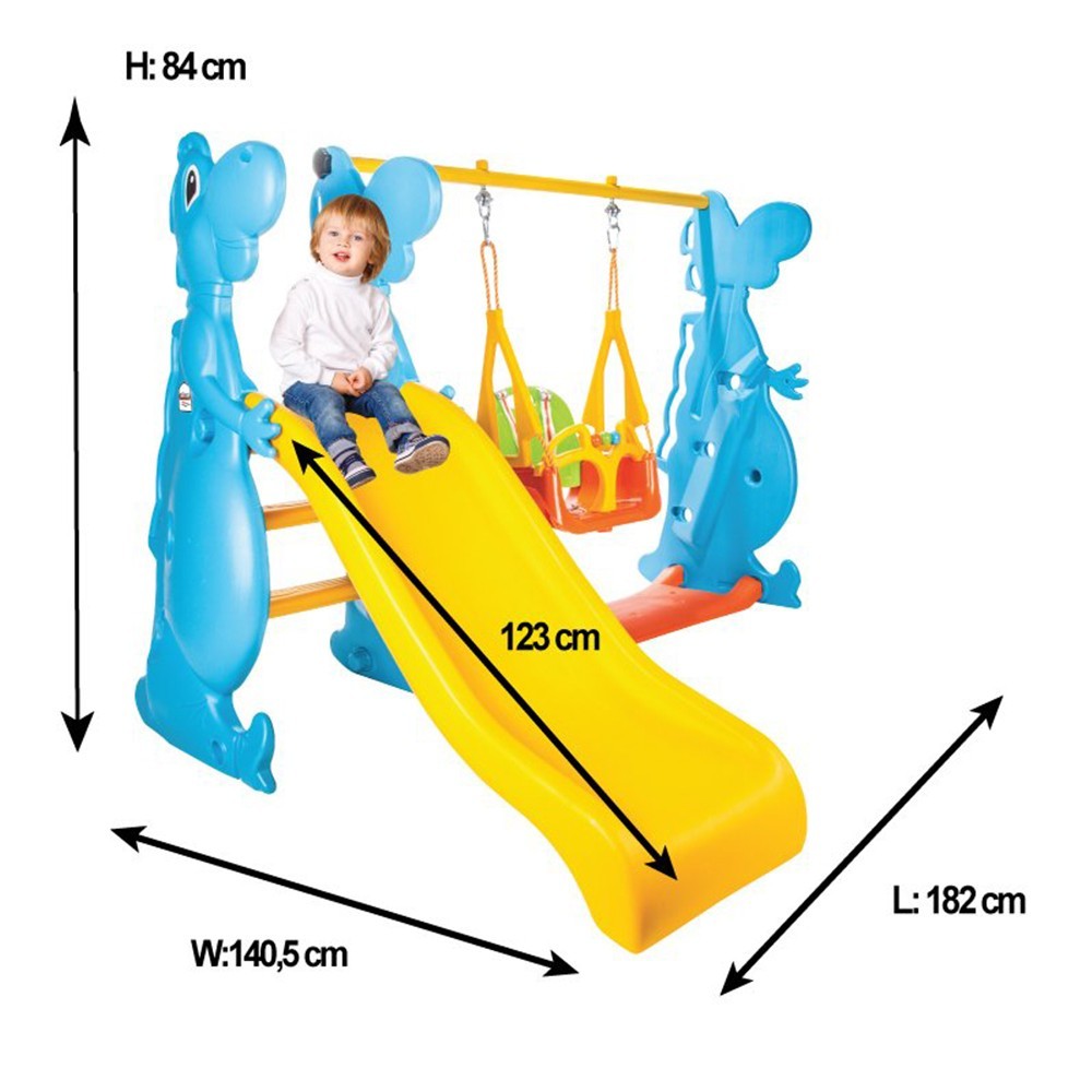 Тази пързалка с люлка е чудесен начин за насърчаване на активното игране и физическото развитие на децата, като същевременно предлага безопасна и забавна среда за игра.