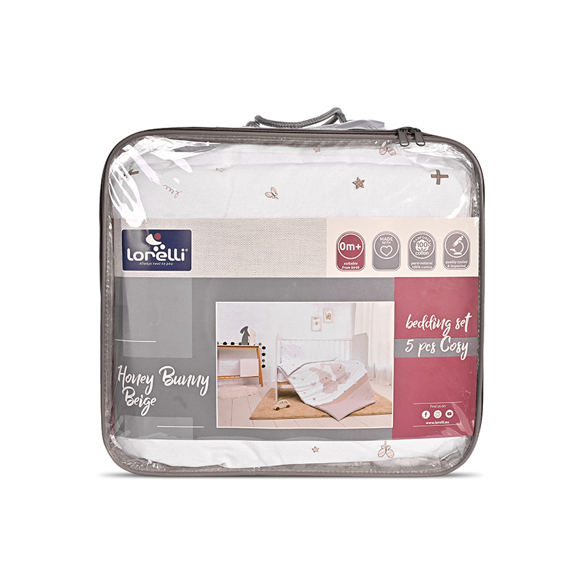 СЕТ COSY 5 ЧАСТИ HONEY BUNNY БЕЖОВО РАНФОРС 2024 е идеално решение за вашето малко дете. Голяма гама бебешки спални комплекти.
