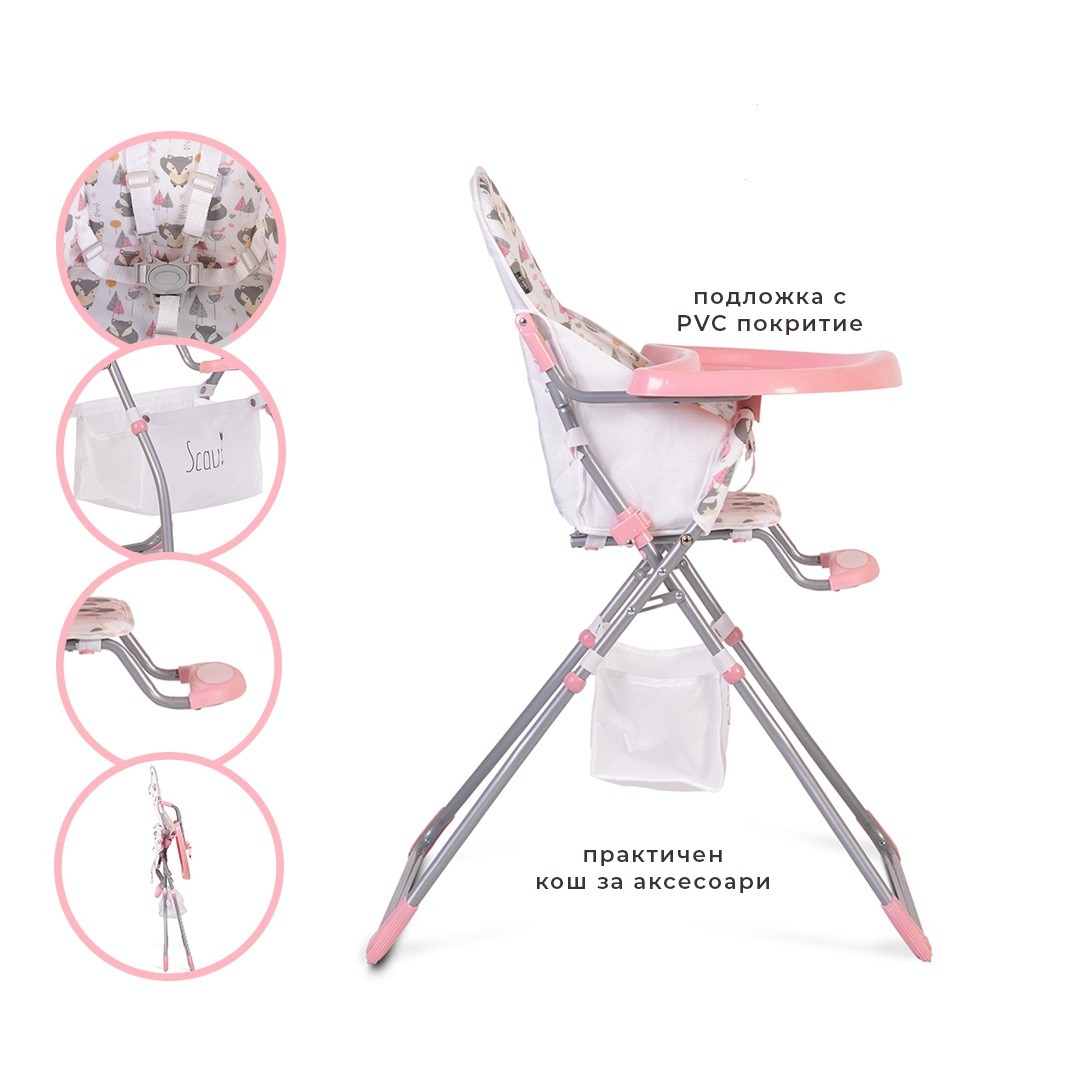Столче за хранене Scaut розово е съвременно и стилно решение за хранене на вашето дете, което съчетава функционалност и модерен дизайн. Специално проектирано за деца над 6 месеца и с максимално тегло до 15 кг, то е идеалният избор за родителите, които търсят комфорт и безопасност за своите малки.