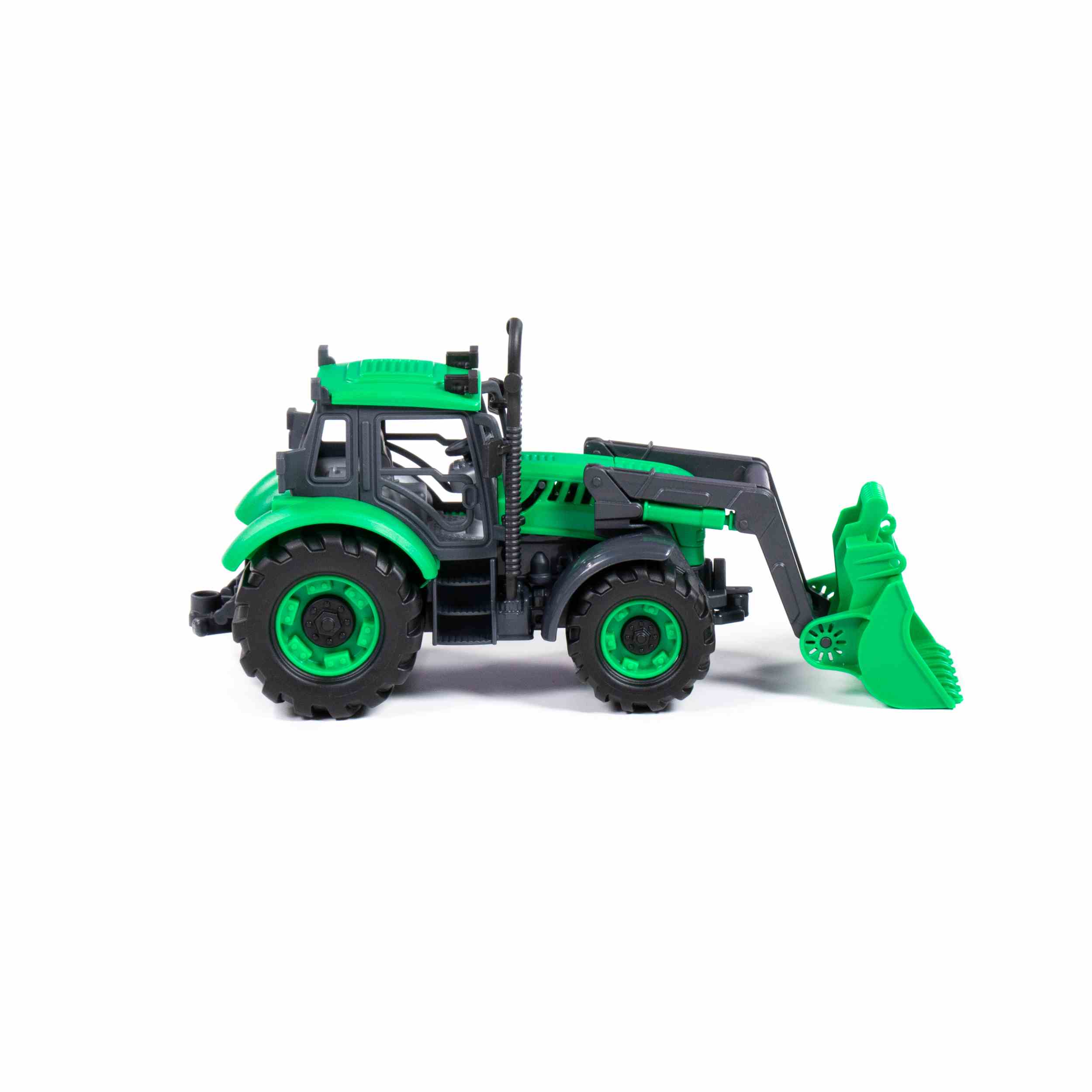 Дизайн: Тракторът е с реалистичен дизайн и ярки цветове, които привличат вниманието на децата. Той включва подвижни части, като кофа и ремарке, които добавят допълнителна реалистичност и забавление при игра.