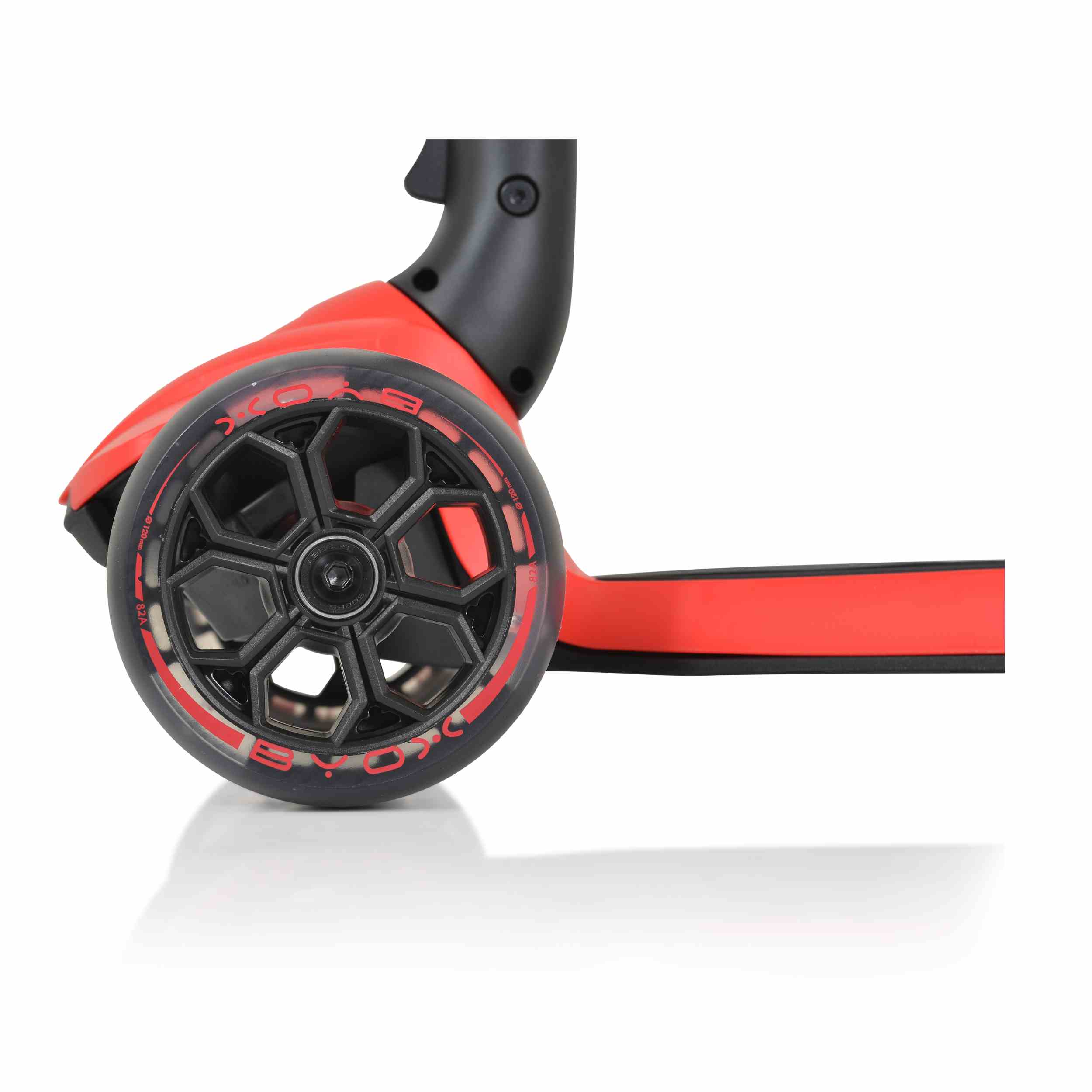 Полиуретанови колела с LED светлини: Предните колела са с размери 120 x 40 мм и са оборудвани с LED светлини, които осигуряват видимост на тъмно и в мрачни дни123. Задното колело е с размери 80 x 40 мм и също има светещ ефект.