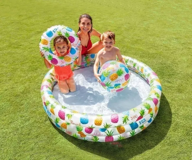 Надуваем комплект детски басейн, топка и пояс Ананас/Рибки INTEX 59469 е перфектният избор за всяко дете, което обича водните игри. Със своите ярки цветове и забавен дизайн, този комплект гарантира часове на радост и забавление.