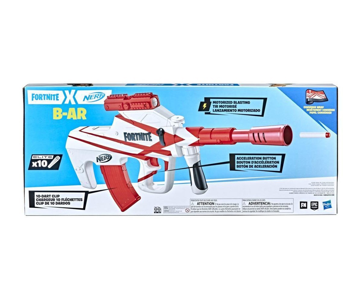 NERF Fortnite Motorized Dart Blaster B-AR е бластер, който съчетава вълнението от популярната видеоигра Fortnite с реалната динамика на игра с Нърф. Този моторизиран бластер е вдъхновен от легендарното и епично оръжие Burst Assault Rifle от Fortnite и притежава уникален дизайн, базиран на вътрешната обвивка Converge от играта.